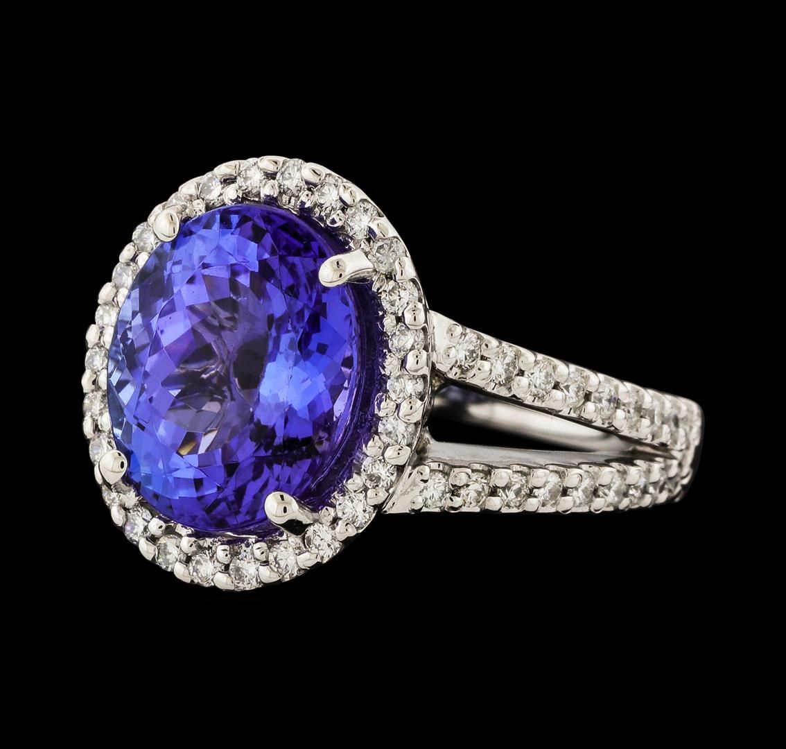 One electronically tested 14KT white gold lady's cast fashion ring with a split shank basket halo with a bright polish finish. The featured lady's ring has a shank measuring 2.92 millimeters wide. Identified with markings of '14K'. Condition is new, good workmanship. Containing: One prong set oval modified brilliant cut natural tanzanite, measuring 11.58 x 9.46 x 6.58mm, (depth est.) approximate weight of 5.10ct., clarity is eye clean, medium, very slightly grayish, violet color, (GIA V 5/3), cut is very good. Transmitting light with no distortion, transparent. Colored gemstones are presumed to have been subjected to commonly used enhancement processes. Graded in the setting. Sixty-Two prong set round brilliant cut diamonds, measuring 1.40 - 1.35 x 0.86mm (depth est.) approximate total weight of 62 Stones = 0.61ct. Graded in the setting. Clarity SI-1 to SI-2. Color: G - H Cut Good. Total Weight of Colored Stones 5.10ct.. Total Weight of Diamonds 0.61ct.. Total Weight of Ring 8.20gm GAS Appraised at $8,255.00.