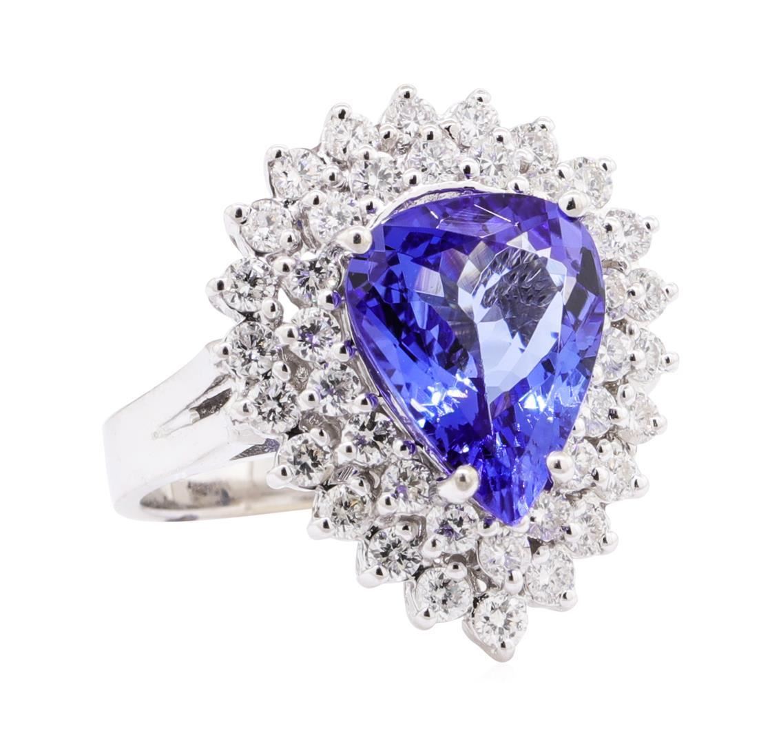 One electronically tested 14KT white gold lady's cast fashion ring with a double basket halo with a bright polish finish. The featured lady's ring has a cathedral shank measuring 3.10 millimeters wide. Identified with markings of '14K'. Condition is new, good workmanship. Containing: One prong set pear modified mixed cut natural tanzanite, measuring 12.22 x 9.65 x 5.04mm, (depth est.) approximate weight of 3.91ct., clarity is eye clean, medium dark, very slightly grayish, violetish blue color, (GIA vB 6/3), cut is very good. Transmitting light with no distortion, transparent. Colored gemstones are presumed to have been subjected to commonly used enhancement processes. Graded in the setting. Forty prong set round brilliant cut diamonds, measuring 2.00 - 1.95 x 1.23mm (depth est.) approximate total weight of 40 Stones = 1.19ct. Graded in the setting. Color H - I Clarity VS-2 to SI-2 Cut Very Good. Total Weight of Colored Stones 3.91ct.. Total Weight of Diamonds 1.19ct.. Total Weight of Ring 7.80gm GAS Appraised at $9405.00. GAS Appraised.
