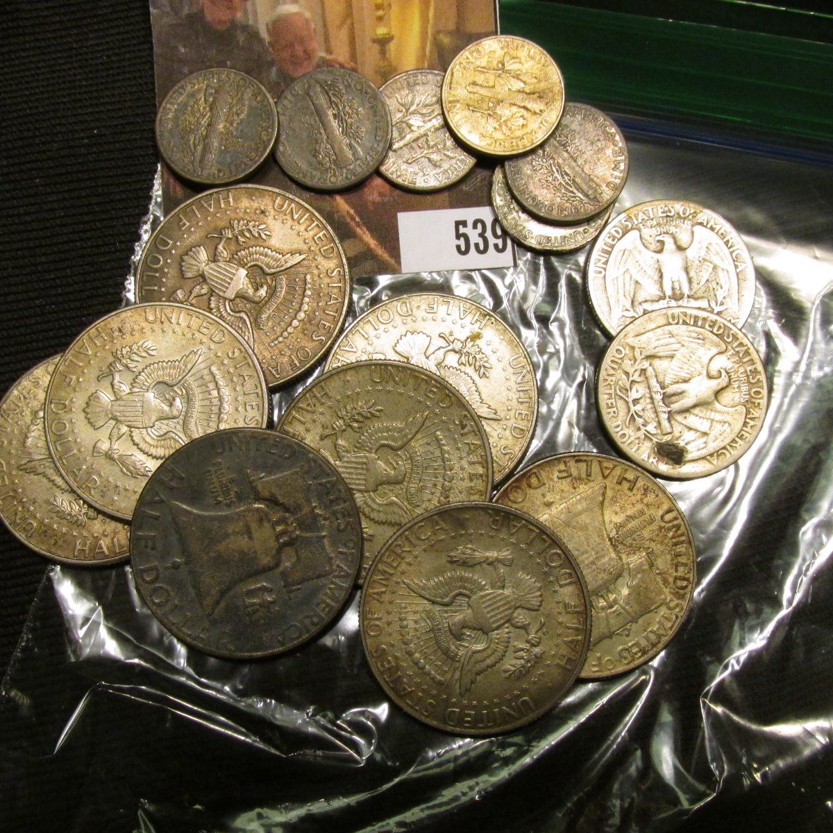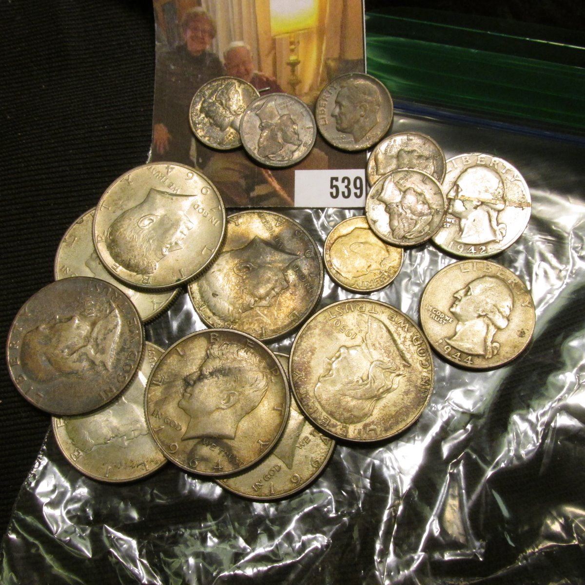 $5.10 of 90% silver, includes 6 -64 Kennedys, 2 Franklins, 2 Washington quarters, 6 silver dimes