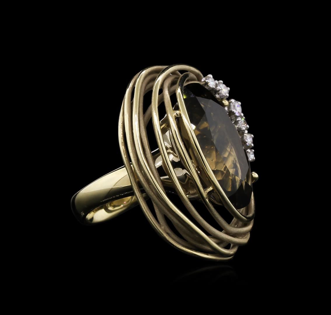 One electronically tested 18KT yellow gold lady's combination cast & assembled fashion ring with a bright polish finish. The featured lady's ring has a shank measuring 4.18 millimeters wide. Identified with markings of "750". Condition is used, good workmanship. Containing: One prong set oval modified brilliant cut natural smoky quartz, measuring 19.85 x 15.60 x 7.61mm, approximate weight of 5.10ct., clarity is eye clean, medium light, very slightly grayish, brown color, (GIA Br 4/3), cut is good. Colored gemstones are presumed to have been subjected to commonly used enhancement processes. Graded in the setting. Six prong set round brilliant cut diamonds, measuring 2.70 - 1.80 x 1.40mm (depth est.) approximate. Total Weight of 6 Stones = 0.26ct. Graded in the setting. Clarity: VS-2 to SI-1. Color: G - H. Cut Very Good. Total Weight of Colored Stones 5.10ct. Total Weight of Diamonds 0.26ct. Total Weight of Ring 16.50gm. GAS Appraised at $3,950.00.