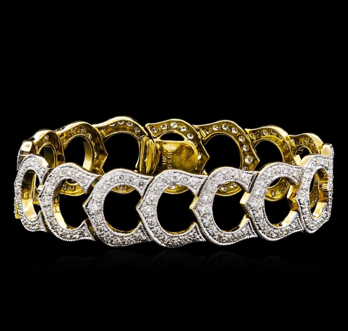 One electronically tested 18KT yellow gold lady's combination cast & assembled fashion bracelet with a tongue clasp with a bright polish with milgrain detailing finish. The featured lady's bracelet has custom links with a "C" motif and measures 7 inches in length with a width of 12 millimeters. Identified with markings of "18K 750". Condition is new, good workmanship. Containing: Two Hundred Eight bead set round brilliant cut diamonds, measuring 2.10 - 1.65 x 1.15mm (depth est.) approximate total weight of 208 Stones = 5.11ct. Graded in the setting. Clarity: VS-1 to SI-1. Color: F - Very Good. Total Weight of Diamonds 5.11ct. Total Weight of Bracelet 34.00gm. GAS Appraised at $23,255.00.