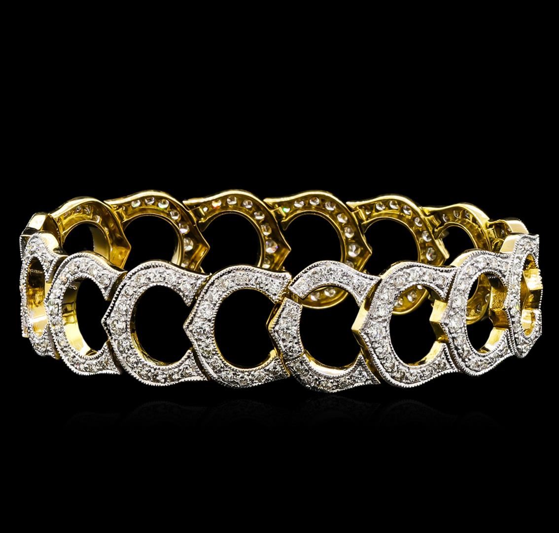 One electronically tested 18KT yellow gold lady's combination cast & assembled fashion bracelet with a tongue clasp with a bright polish with milgrain detailing finish. The featured lady's bracelet has custom links with a "C" motif and measures 7 inches in length with a width of 12 millimeters. Identified with markings of "18K 750". Condition is new, good workmanship. Containing: Two Hundred Eight bead set round brilliant cut diamonds, measuring 2.10 - 1.65 x 1.15mm (depth est.) approximate total weight of 208 Stones = 5.11ct. Graded in the setting. Clarity: VS-1 to SI-1. Color: F - Very Good. Total Weight of Diamonds 5.11ct. Total Weight of Bracelet 34.00gm. GAS Appraised at $23,255.00.