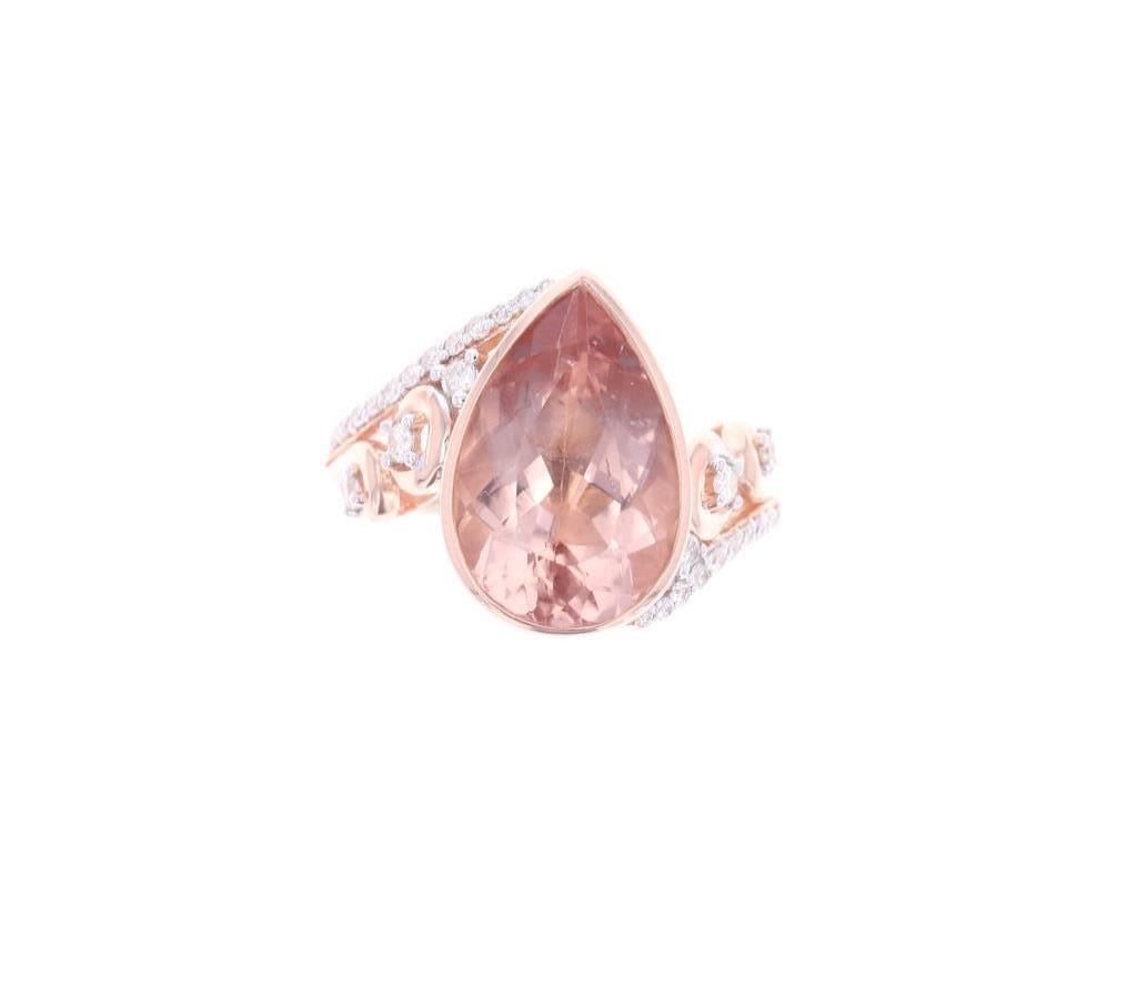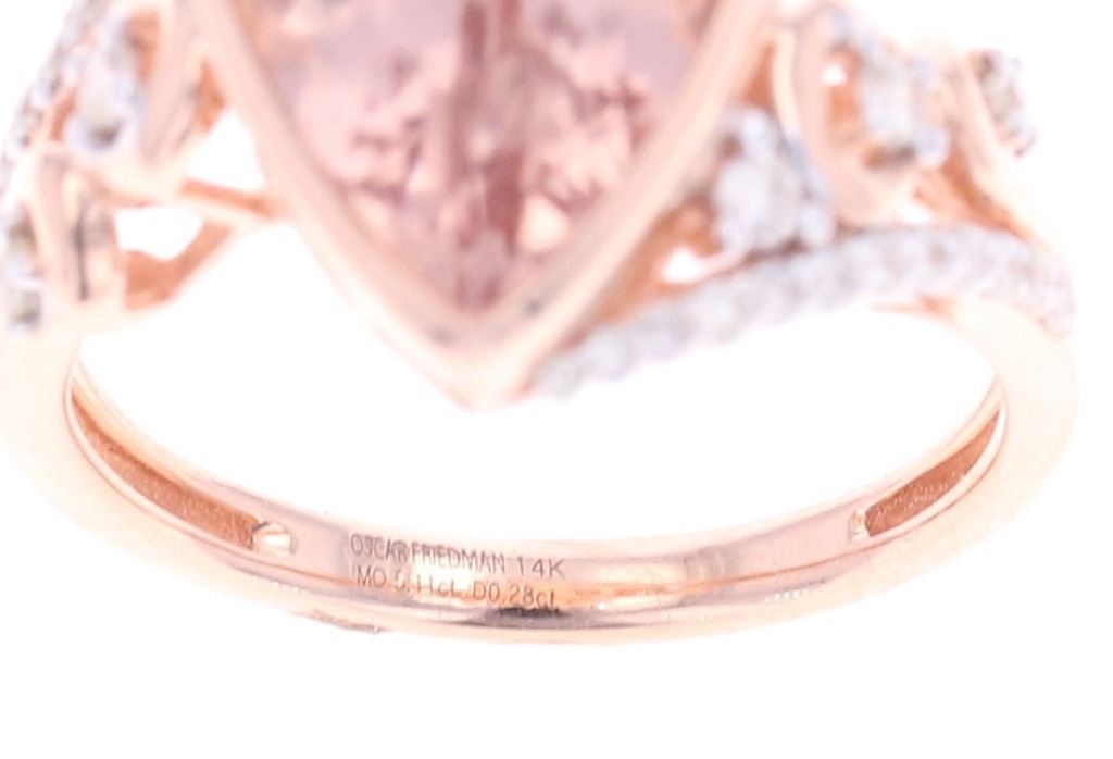 Featured in this lot is this 5.11ct morganite and diamond 14k two tone gold ring with GGA paperwork. The ring features a polished, stamped, and tested 14k two tone gold construction and is marked in the inside of the ring band as follows: Oscar Friedman - 14k. The ring features a natural pear brilliant cut morganite gemstone with measurements of 14.98 x 10.19mm with type I clarity and a pinkish orange "Peachy" coloration with excellent symmetry and a total weight of 5.11ct. The intricate whorl and pave shoulders are decorated with a total of 28 round brilliant cut diamonds that shows measurements of 1.8 x 0.9mm with clarity of SI1 - SI2 and a coloration of G - H and a total diamond weight of 0.28ct. The piece comes complete with GGA(GemAssure Gemological Appraisals, GGA Appraisal Number#: GGA070559 and trace number: RN036694) report and appraisal confirming the above info and giving a total value of $8,860.00. The ring size is US 7.