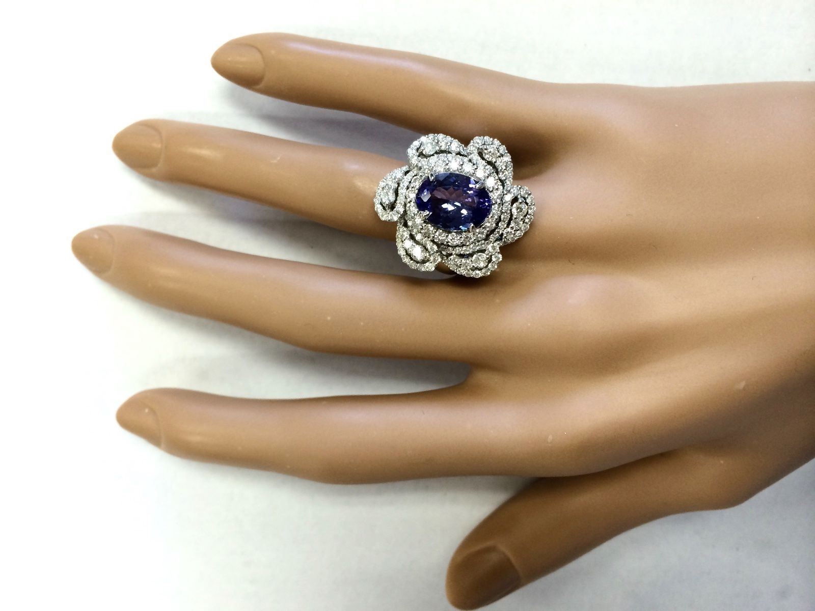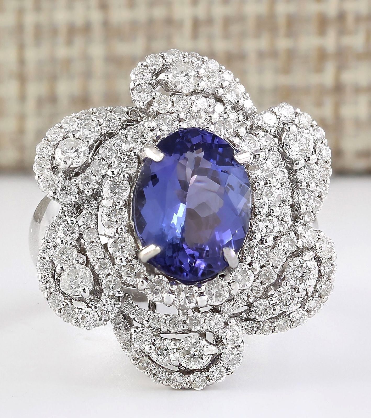 5.11tw Natural Blue Tanzanite And Diamond Ring 18K Solid White Gold