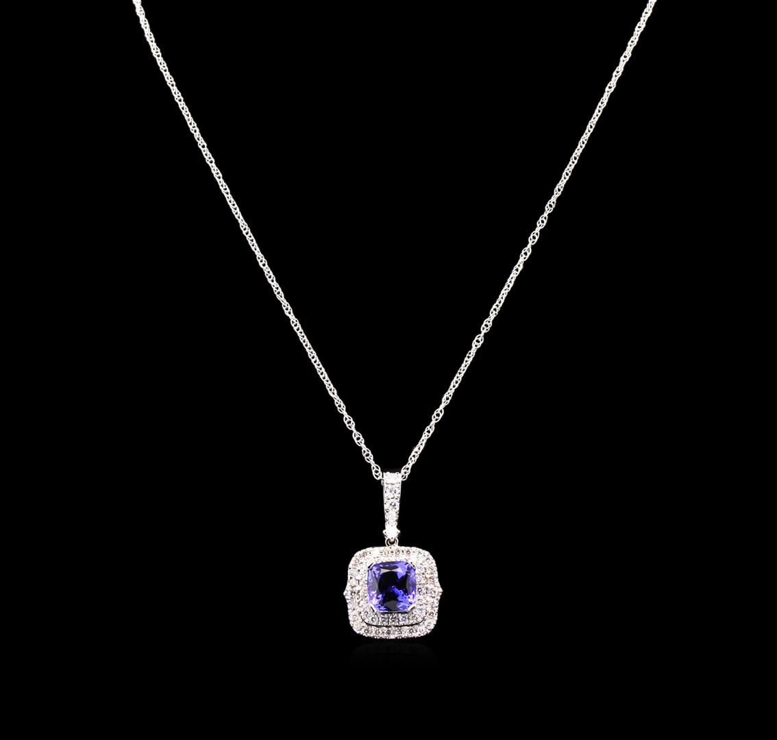 One electronically tested 14KT white gold lady's combination cast & assembled fashion pendant & chain 18.0" long, 1.7mm loose rope chain with a spring ring clasp with a bright polish finish. Identified with markings of "14K". Condition is new, good workmanship. Containing: One prong set square cushion modified brilliant cut natural tanzanite, measuring 9.90 x 9.65 x 6.45mm, 5% bulge factor, approximate weight of 5.12ct., clarity is eye clean, type I, medium, very slightly grayish, bluish violet color, (GIA bV 5/3), cut is good. Transmitting light with no distortion, transparent. Colored gemstones are presumed to have been subjected to commonly used enhancement processes. Graded in the setting. Seven split prong set round brilliant cut diamonds, measuring 2.50 - 2.45 x 1.49mm (depth est.) approximate total weight of 7 Stones = 0.40ct. Graded in the setting. Clarity: SI-2 to I-1. Color: H - I. Cut Good Forty-Four split prong set round brilliant cut diamonds, measuring 1.80 - 1.70 x 1.14mm (depth est.) approximate total weight of 44 Stones = 0.96ct. Graded in the setting. Clarity: SI-2 to I-1. Color: H - I. Cut Good. Total Weight of Colored Stones 5.12ct. Total Weight of Diamonds 1.36ct. Total Weight of Pendant & Chain 8.90gm. GAS Appraised at $10,580.00.