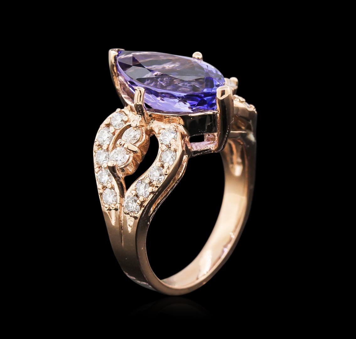 One stamped & tested 14KT rose gold lady's cast ring with a flat shank with a bright polish finish. Condition is new. Containing: Twenty-four bead set round brilliant cut diamonds, measuring 2.25 - 2.10 x 1.31mm (depth est.) approximate total weight of 24 Stones = 0.86ct. Clarity: SI-1 to SI-2. Color: H - I. Cut: Good. One prong set marquise modified brilliant cut natural tanzanite, measuring 15.70 x 8.50 x 6.00mm, approximate weight of 5.12ct., clarity is eye clean, type I, medium, very slightly grayish, violetish blue color, (GIA vB 5/3), cut is very good. Total Weight of Colored Stones: 5.12ct. Total Weight of Diamonds: 0.86ct. Total Weight of Ring: 8.40 gm. GAS Appraised at $9,655.00.