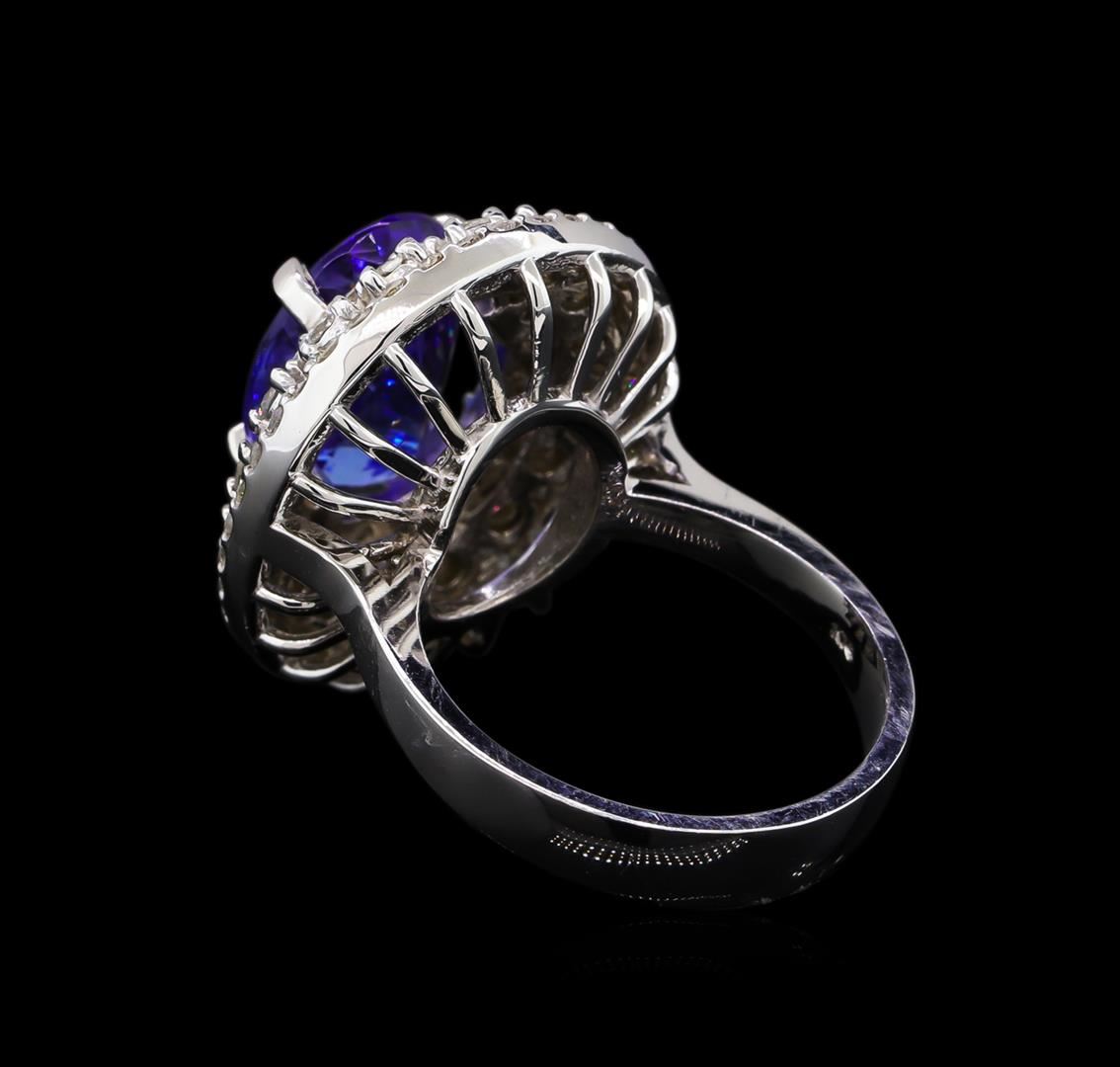 One electronically tested 14KT white gold lady's cast fashion ring with a triple basket halo with a bright polish finish. The featured lady's ring has a shank measuring 4.07 millimeters wide. Identified with markings of "K14". Condition is new, good workmanship. Containing: One prong set oval modified brilliant cut natural tanzanite, measuring 12.70 x 9.90 x 5.98mm, approximate weight of 5.12ct., clarity is eye clean, type I, medium, moderately strong, violetish blue color, (GIA vB 5/4), cut is good. Transmitting light with no distortion, transparent. Colored gemstones are presumed to have been subjected to commonly used enhancement processes. Graded in the setting. Sixteen prong set round brilliant cut diamonds, measuring 2.40 - 2.30 x 1.46mm (depth est.) approximate total weight of 16 Stones = 0.80ct. Graded in the setting. Clarity: SI-1 to SI-2. Color: G - I. Cut Good Sixty-Two prong set round brilliant cut diamonds, measuring 1.50 - 1.40 x 0.90mm (depth est.) approximate total weight of 62 Stones = 0.72ct. Graded in the setting. Clarity: SI-1 to SI-2. Color: H - I. Cut Good. Total Weight of Colored Stones 5.12ct. Total Weight of Diamonds 1.52ct. Total Weight of Ring 10.70gm. GAS Appraised at $13,355.00.