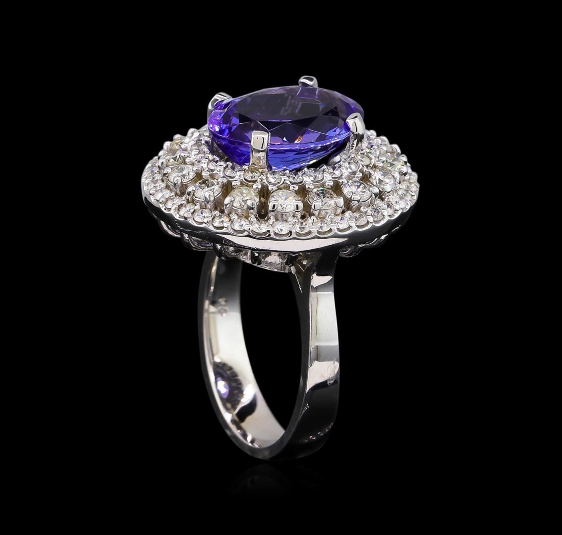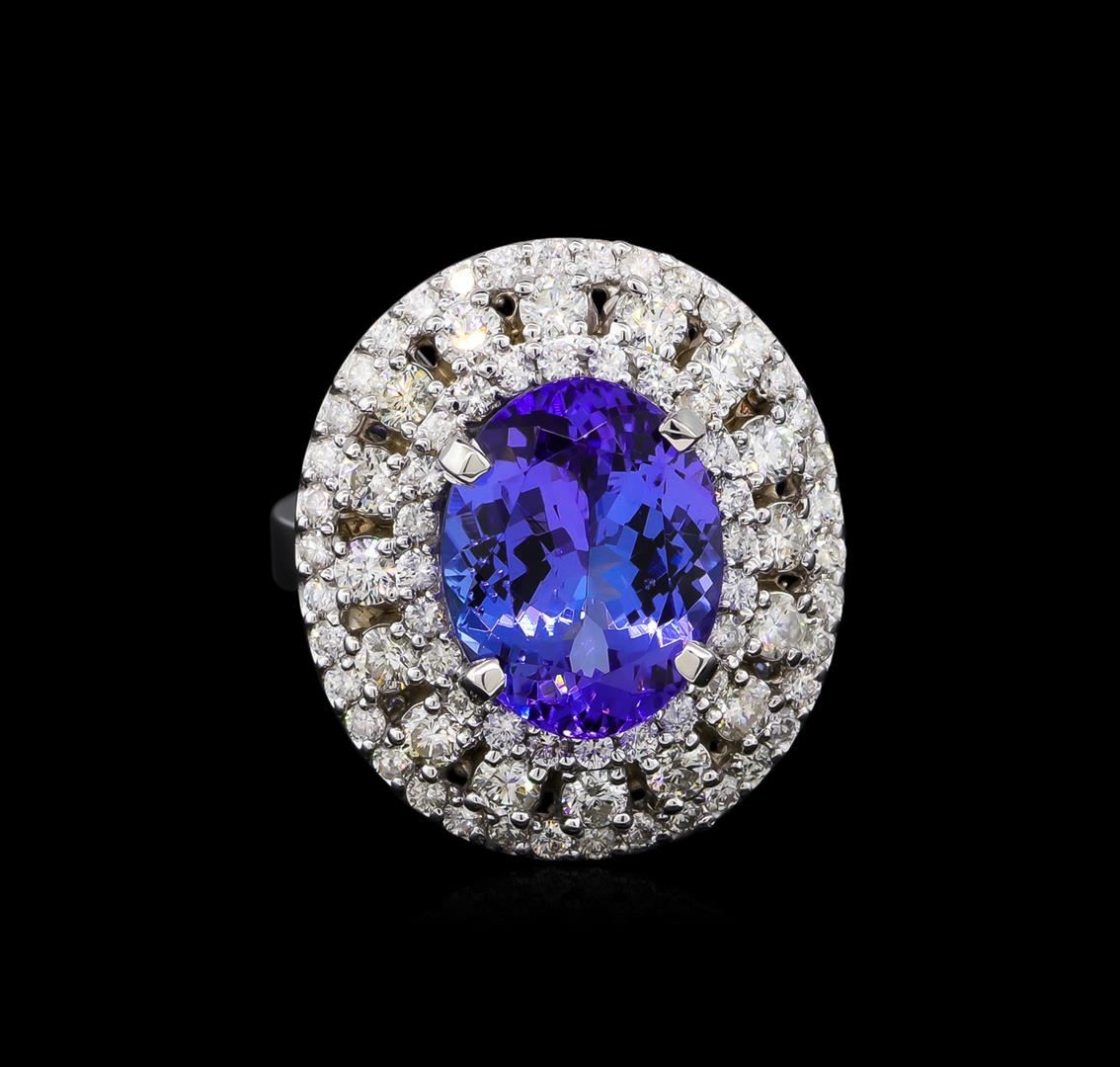 One electronically tested 14KT white gold lady's cast fashion ring with a triple basket halo with a bright polish finish. The featured lady's ring has a shank measuring 4.07 millimeters wide. Identified with markings of "K14". Condition is new, good workmanship. Containing: One prong set oval modified brilliant cut natural tanzanite, measuring 12.70 x 9.90 x 5.98mm, approximate weight of 5.12ct., clarity is eye clean, type I, medium, moderately strong, violetish blue color, (GIA vB 5/4), cut is good. Transmitting light with no distortion, transparent. Colored gemstones are presumed to have been subjected to commonly used enhancement processes. Graded in the setting. Sixteen prong set round brilliant cut diamonds, measuring 2.40 - 2.30 x 1.46mm (depth est.) approximate total weight of 16 Stones = 0.80ct. Graded in the setting. Clarity: SI-1 to SI-2. Color: G - I. Cut Good Sixty-Two prong set round brilliant cut diamonds, measuring 1.50 - 1.40 x 0.90mm (depth est.) approximate total weight of 62 Stones = 0.72ct. Graded in the setting. Clarity: SI-1 to SI-2. Color: H - I. Cut Good. Total Weight of Colored Stones 5.12ct. Total Weight of Diamonds 1.52ct. Total Weight of Ring 10.70gm. GAS Appraised at $13,355.00.