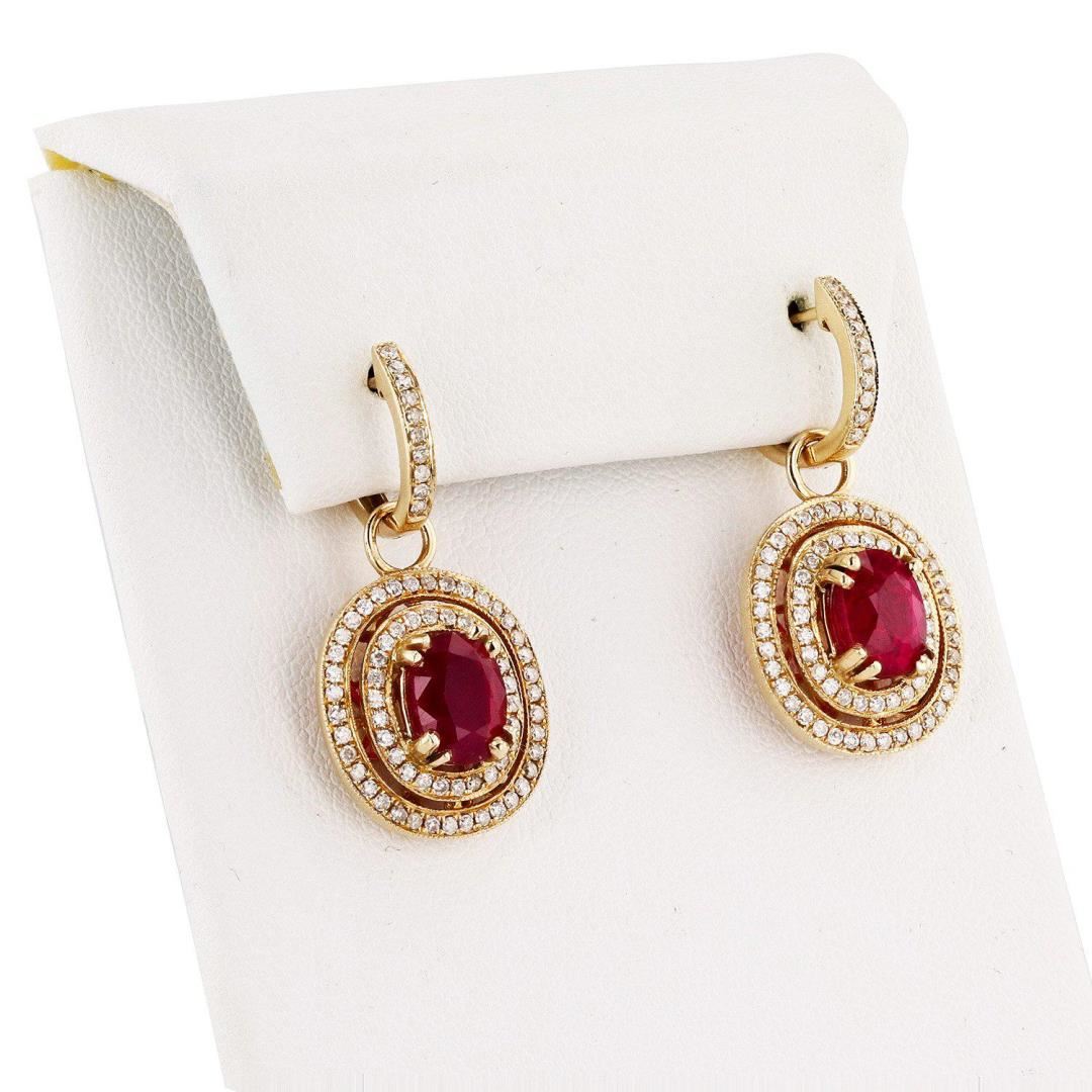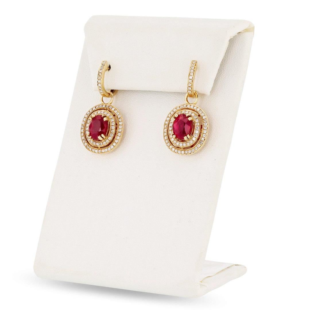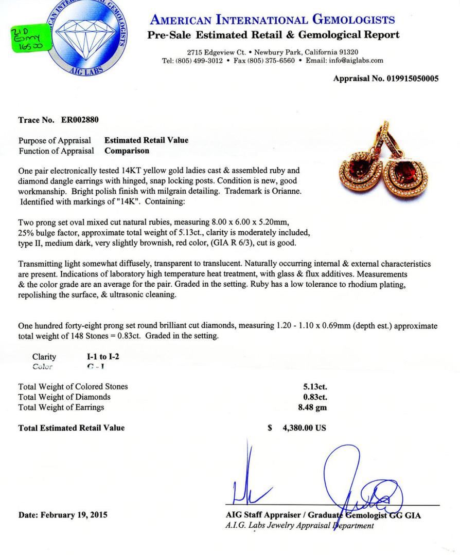One pair electronically tested 14KT yellow gold ladies cast and assembled ruby and diamond dangle earrings with hinged, snap locking posts. Condition is new, good workmanship. Bright polish finish with milgrain detailing. Trademark is Orianne. Identified with markings of "14K". Containing: Two prong set oval mixed cut natural rubies, measuring 8.00mm x 6.00mm x 5.20mm, 25% bulge factor, approximate total weight of 5.13ct., clarity is moderately included, type II, medium dark, very slightly brownish, red color, (GIA R 6/3), cut is good. Transmitting light somewhat diffusely, transparent to translucent. Naturally occurring internal and external characteristics are present. Indications of laboratory high temperature heat treatment, with glass and flux additives. Measurements and the color grade are an average for the pair. Graded in the setting. Ruby has a low tolerance to rhodium plating, repolishing the surface, and ultrasonic cleaning. One hundred forty-eight prong set round brilliant cut diamonds, measuring 1.20mm to 1.10mm x 0.69mm (depth est.) approximate total weight of 148 Stones = 0.83ct. Graded in the setting. Clarity I1 to I2 Color G - I Total Weight of Colored Stones 5.13ct. Total Weight of Diamonds 0.83ct. Total Weight of Earrings 8.48 gm