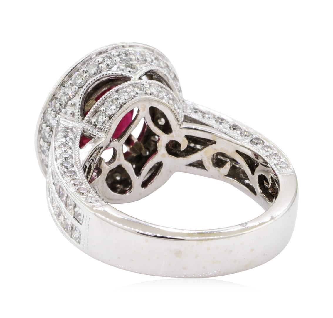 One electronically tested 18KT white gold lady's combination cast & assembled fashion ring with a cathedral halo with a bright polish with milgrain detailing finish. The featured lady's ring has a shank measuring 4.60 millimeters wide. Identified with markings of '18K'. Condition is new, good workmanship. Containing: One prong set oval modified mixed cut natural ruby, measuring 9.09 x 7.02 x 4.05mm, (depth est.) 20%. bulge factor, approximate weight of 2.68ct., clarity is moderately included, medium dark, strong, red color, (GIA R 6/5), cut is good. Transmitting light somewhat diffusely, transparent to translucent. Naturally occurring internal & external characteristics are present. Indications of laboratory high temperature heat treatment. Colored gemstones are presumed to have been subjected to commonly used enhancement processes. Graded in the setting. Thirty-Six channel set princess cut diamonds, measuring 1.70 x 1.60 x 1.20mm (depth est.) approximate total weight of 36 Stones = 1.00ct. Graded in the setting. Color I - K Clarity VS-2 to SI-1 Cut Very Good Twenty-Two prong set round brilliant cut diamonds, measuring 1.90 - 1.80 x 1.15mm (depth est.) approximate total weight of 22 Stones = 0.55ct. Graded in the setting. Color G - I Clarity VS-2 to SI-1 Cut Good Eighty prong set round brilliant cut diamonds, measuring 1.50 - 1.40 x 0.90mm (depth est.) approximate total weight of 80 Stones = 0.90ct. Graded in the setting. Color G - I Clarity SI-1 to SI-2 Cut Good. Total Weight of Colored Stones 2.68ct.. Total Weight of Diamonds 2.45ct.. Total Weight of Ring 10.00gm GAS Appraised at  $11925.00. GAS Appraised.