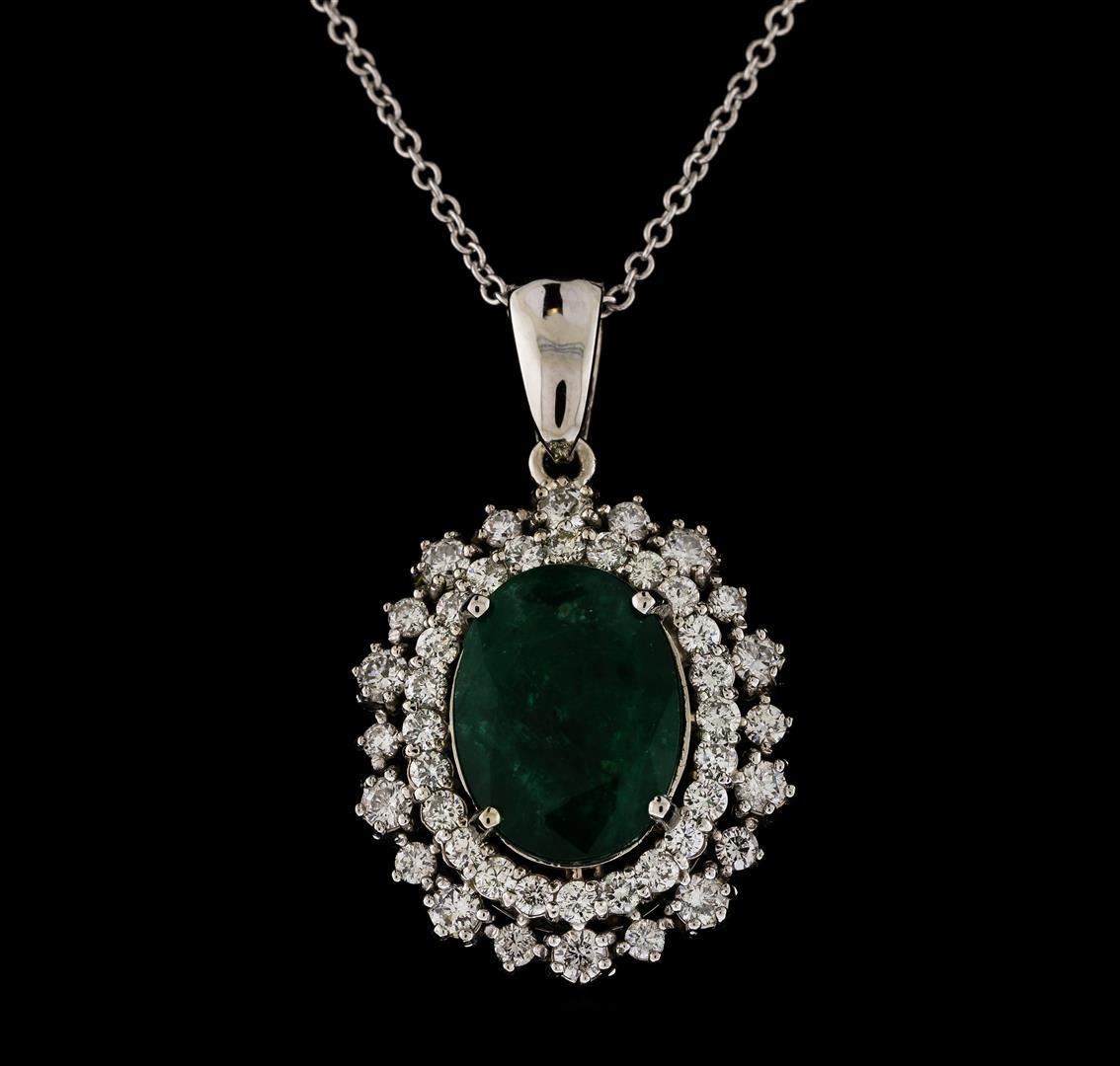 One electronically tested 14KT white gold lady's cast fashion pendant & chain 18.0' long, 1.2mm round cable link with a lobster claw clasp with a staggered double basket halo with a bright polish finish. Identified with markings of 'K14'. Condition is new, good workmanship. Containing: One prong set oval modified mixed cut natural emerald, measuring 12.68 x 9.44 x 6.20mm, (depth est.) 20%. bulge factor, approximate weight of 5.14ct., clarity is heavily included, medium dark, moderately strong, green color, (GIA G 6/4), cut is good. Transmitting light somewhat diffusely, semi-transparent to translucent. Naturally occurring internal & external characteristics are present. Indications of oil residue. Colored gemstones are presumed to have been subjected to commonly used enhancement processes. Graded in the setting. Ten prong set round brilliant cut diamonds, measuring 2.30 - 2.20 x 1.37mm (depth est.) approximate total weight of 10 Stones = 0.42ct. Graded in the setting. Clarity SI-1 to SI-2. Color: H - I Cut Good Thirty-Four prong set round brilliant cut diamonds, measuring 1.80 - 1.75 x 1.10mm (depth est.) approximate total weight of 34 Stones = 0.74ct. Graded in the setting. Clarity SI-1 to SI-2. Color: H - I Cut Good. Total Weight of Colored Stones 5.14ct.. Total Weight of Diamonds 1.16ct.. Total Weight of Pendant & Chain 6.90gm. GAS Appraised.