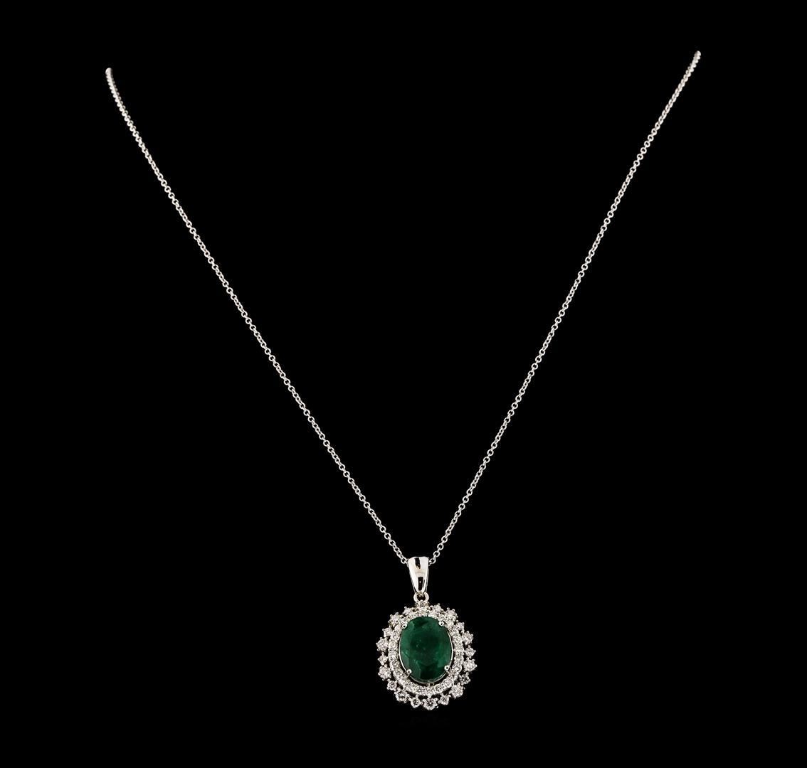 One electronically tested 14KT white gold lady's cast fashion pendant & chain 18.0' long, 1.2mm round cable link with a lobster claw clasp with a staggered double basket halo with a bright polish finish. Identified with markings of 'K14'. Condition is new, good workmanship. Containing: One prong set oval modified mixed cut natural emerald, measuring 12.68 x 9.44 x 6.20mm, (depth est.) 20%. bulge factor, approximate weight of 5.14ct., clarity is heavily included, medium dark, moderately strong, green color, (GIA G 6/4), cut is good. Transmitting light somewhat diffusely, semi-transparent to translucent. Naturally occurring internal & external characteristics are present. Indications of oil residue. Colored gemstones are presumed to have been subjected to commonly used enhancement processes. Graded in the setting. Ten prong set round brilliant cut diamonds, measuring 2.30 - 2.20 x 1.37mm (depth est.) approximate total weight of 10 Stones = 0.42ct. Graded in the setting. Clarity SI-1 to SI-2. Color: H - I Cut Good Thirty-Four prong set round brilliant cut diamonds, measuring 1.80 - 1.75 x 1.10mm (depth est.) approximate total weight of 34 Stones = 0.74ct. Graded in the setting. Clarity SI-1 to SI-2. Color: H - I Cut Good. Total Weight of Colored Stones 5.14ct.. Total Weight of Diamonds 1.16ct.. Total Weight of Pendant & Chain 6.90gm. GAS Appraised.