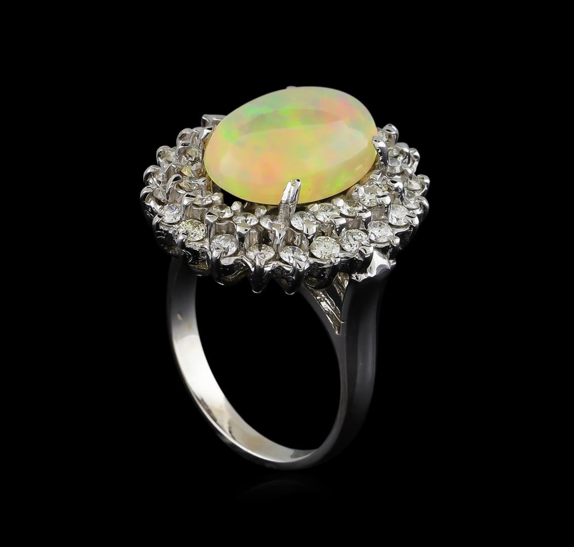 One electronically tested 14KT white gold ladies cast opal and diamond ring with a bright polish finish. The featured opal is set within two tiered diamond floret bezels, completed by a two millimeter wide band. Identified with markings of "14K". Condition is new, good workmanship. Containing: One semi crystal opal that is cut in a oval shaped cabochon and is prong set, measuring 14.00 mm long x 10.05 mm wide, and 5.75 mm thick and the approximate weight is 5.14 carats. The opal has a quite bright, red multicolor play of color (fire) in a flashfire pattern; a medium dome; a good cut; no inclusions; consistent in its brightness and pattern; and is slightly directional. Graded in the setting. Twenty-Two prong set round brilliant cut diamonds, measuring 2.00 - 2.00 x 1.20mm (depth est.) approximate total weight of 22 Stones = 0.74ct. Graded in the setting. Clarity: I-1 to I-2. Color: F - H Twenty-Two prong set round brilliant cut diamonds, measuring 1.80 - 1.80 x 1.08mm (depth est.) approximate total weight of 22 Stones = 0.56ct. Graded in the setting. Clarity: I-1 to I-2. Color: F - H. Total Weight of Diamonds 1.30ct. Total Weight of Opals 5.14ct. Total Weight of Ring 8.23gm. AIG Appraised.