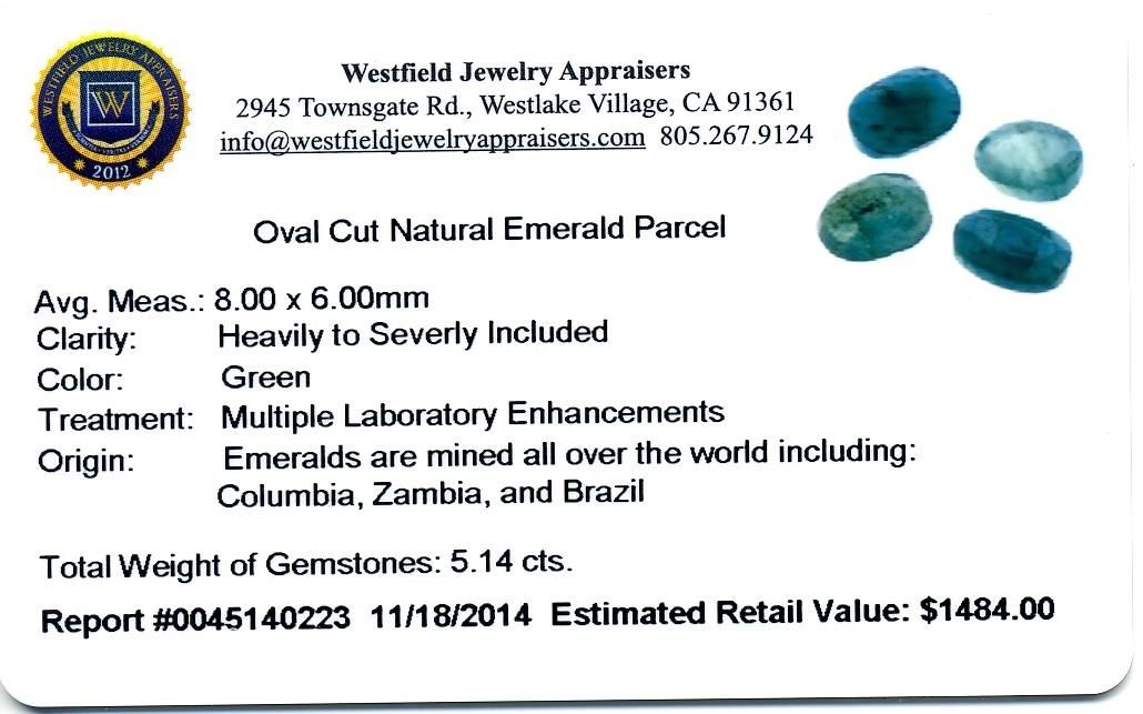 5.14cts. Oval Cut Natural Emerald Parcel Westfield Appraised at $1,484.00.