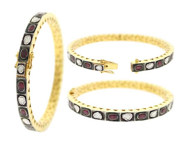 RUBY AND ROSE CUT DIAMOND ROUND BANGLE/Diamond Count 1:/Diamond Count 1 TCW:0.8/Diamond Color & Clarity:J-L/I1-I2/Diamond Count 2:/Diamond Count 2 TCW:/Diamond Color & Clarity:/Diamond Count 3:/Diamond Count 3 TCW:/Gemstone Count 1:/Gemstone Count 1 TCW:4.35/Dimension:/Metal Type:14k Gold Yellow Gold /Weight Gram:3.34over 0.925 SilverSterling Silver /Weight Gram:22.24/Gross Weight:26.61