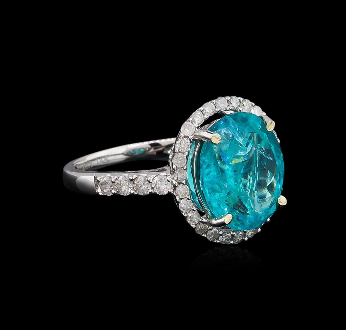 One electronically tested 14KT white gold lady's cast fashion ring with a cathedral halo with a bright polish finish. The featured ladies ring has a shank measuring 1.83 millimeters in width. Trademark is Orianne. Identified with markings of "14K". Condition is new, good workmanship. Containing: One prong set oval modified brilliant cut natural apatite, measuring 11.98 x 9.95 x 6.47mm, approximate weight of 5.15ct., clarity is moderately included, medium, moderately strong, bluish green color, (GIA bG 5/4), cut is good. Transmitting light somewhat diffusely, transparent to translucent. Naturally occurring internal & external characteristics are present. Colored gemstones are presumed to have been subjected to commonly used enhancement processes. Graded in the setting. Eight prong set round brilliant cut diamonds, measuring 2.00 - 1.95 x 1.27mm (depth est.) approximate total weight of 8 Stones = 0.24ct. Graded in the setting. Clarity: I-1 to I-2. Color: H - I. Cut Good Twenty-Six prong set round brilliant cut diamonds, measuring 1.70 - 1.60 x 1.04mm (depth est.) approximate total weight of 26 Stones = 0.40ct. Graded in the setting. Clarity: I-1 to I-2. Color: H - I. Cut Good. Total Weight of Colored Stones 5.15ct. Total Weight of Diamonds 0.64ct. Total Weight of Ring 4.20gm. GAS Appraised at $4,345.00.