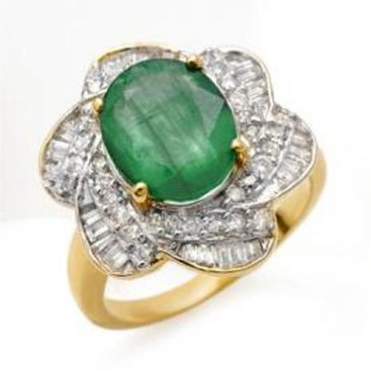 Diamond: 36 Round cut @ 1.48 ctw Clarity: SI-I Color: H-K Gemstone: Natural Emerald Gemstone color: GreenGemstone quality: Good-to-Very Good Gemstone Cut & Weight: 1 Oval cut @ 3.67 ctw Metal Purity & Color : 14K Gold-Yellow Gold weight: 7.30 grams Ring size (US): 7Dimension: Approx. 7/8" x 13/16"
