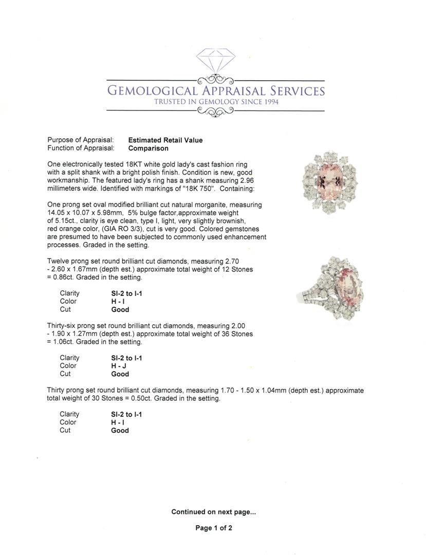 One electronically tested 18KT white gold lady's cast fashion ring with a split shank with a bright polish finish. The featured lady's ring has a shank measuring 2.96 millimeters wide. Identified with markings of "18K 750". Condition is new, good workmanship. Containing: One prong set oval modified brilliant cut natural morganite, measuring 14.05 x 10.07 x 5.98mm, 5% bulge factor, approximate weight of 5.15ct., clarity is eye clean, type I, light, very slightly brownish, red orange color, (GIA RO 3/3), cut is very good. Colored gemstones are presumed to have been subjected to commonly used enhancement processes. Graded in the setting. Twelve prong set round brilliant cut diamonds, measuring 2.70 - 2.60 x 1.67mm (depth est.) approximate total weight of 12 Stones = 0.86ct. Graded in the setting. Clarity: SI-2 to I-1. Color: H - I. Cut Good Thirty-Six prong set round brilliant cut diamonds, measuring 2.00 - 1.90 x 1.27mm (depth est.) approximate total weight of 36 Stones = 1.06ct. Graded in the setting. Clarity: SI-2 to I-1. Color: H - Good Thirty prong set round brilliant cut diamonds, measuring 1.70 - 1.50 x 1.04mm (depth est.) approximate total weight of 30 Stones = 0.50ct. Graded in the setting. Clarity: SI-2 to I-1. Color: H - I. Cut Good Twelve prong set baguette cut diamonds, measuring from 2.50 x 1.25 x 1.06mm (depth est.) to 2.60 x 1.35 x 1.15mm (depth est.) approximate total weight of 12 Stones = 0.40ct. Graded in the setting. Clarity: VS-2 to SI-1. Color: G - I. Cut Good. Total Weight of Colored Stones 5.15ct. Total Weight of Diamonds 2.82ct. Total Weight of Ring 8.10gm. GAS Appraised at $8,700.00.