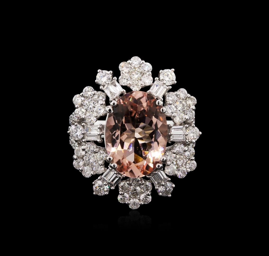 One electronically tested 18KT white gold lady's cast fashion ring with a split shank with a bright polish finish. The featured lady's ring has a shank measuring 2.96 millimeters wide. Identified with markings of "18K 750". Condition is new, good workmanship. Containing: One prong set oval modified brilliant cut natural morganite, measuring 14.05 x 10.07 x 5.98mm, 5% bulge factor, approximate weight of 5.15ct., clarity is eye clean, type I, light, very slightly brownish, red orange color, (GIA RO 3/3), cut is very good. Colored gemstones are presumed to have been subjected to commonly used enhancement processes. Graded in the setting. Twelve prong set round brilliant cut diamonds, measuring 2.70 - 2.60 x 1.67mm (depth est.) approximate total weight of 12 Stones = 0.86ct. Graded in the setting. Clarity: SI-2 to I-1. Color: H - I. Cut Good Thirty-Six prong set round brilliant cut diamonds, measuring 2.00 - 1.90 x 1.27mm (depth est.) approximate total weight of 36 Stones = 1.06ct. Graded in the setting. Clarity: SI-2 to I-1. Color: H - Good Thirty prong set round brilliant cut diamonds, measuring 1.70 - 1.50 x 1.04mm (depth est.) approximate total weight of 30 Stones = 0.50ct. Graded in the setting. Clarity: SI-2 to I-1. Color: H - I. Cut Good Twelve prong set baguette cut diamonds, measuring from 2.50 x 1.25 x 1.06mm (depth est.) to 2.60 x 1.35 x 1.15mm (depth est.) approximate total weight of 12 Stones = 0.40ct. Graded in the setting. Clarity: VS-2 to SI-1. Color: G - I. Cut Good. Total Weight of Colored Stones 5.15ct. Total Weight of Diamonds 2.82ct. Total Weight of Ring 8.10gm. GAS Appraised at $8,700.00.