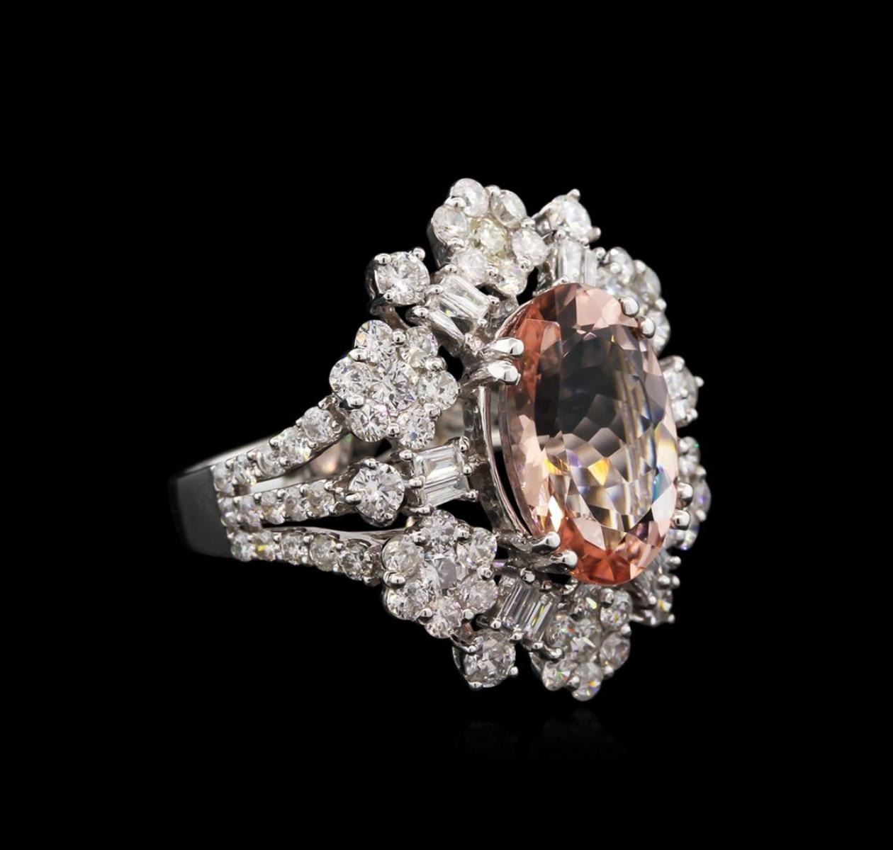 One electronically tested 18KT white gold lady's cast fashion ring with a split shank with a bright polish finish. The featured lady's ring has a shank measuring 2.96 millimeters wide. Identified with markings of "18K 750". Condition is new, good workmanship. Containing: One prong set oval modified brilliant cut natural morganite, measuring 14.05 x 10.07 x 5.98mm, 5% bulge factor, approximate weight of 5.15ct., clarity is eye clean, type I, light, very slightly brownish, red orange color, (GIA RO 3/3), cut is very good. Colored gemstones are presumed to have been subjected to commonly used enhancement processes. Graded in the setting. Twelve prong set round brilliant cut diamonds, measuring 2.70 - 2.60 x 1.67mm (depth est.) approximate total weight of 12 Stones = 0.86ct. Graded in the setting. Clarity: SI-2 to I-1. Color: H - I. Cut Good Thirty-Six prong set round brilliant cut diamonds, measuring 2.00 - 1.90 x 1.27mm (depth est.) approximate total weight of 36 Stones = 1.06ct. Graded in the setting. Clarity: SI-2 to I-1. Color: H - Good Thirty prong set round brilliant cut diamonds, measuring 1.70 - 1.50 x 1.04mm (depth est.) approximate total weight of 30 Stones = 0.50ct. Graded in the setting. Clarity: SI-2 to I-1. Color: H - I. Cut Good Twelve prong set baguette cut diamonds, measuring from 2.50 x 1.25 x 1.06mm (depth est.) to 2.60 x 1.35 x 1.15mm (depth est.) approximate total weight of 12 Stones = 0.40ct. Graded in the setting. Clarity: VS-2 to SI-1. Color: G - I. Cut Good. Total Weight of Colored Stones 5.15ct. Total Weight of Diamonds 2.82ct. Total Weight of Ring 8.10gm. GAS Appraised.