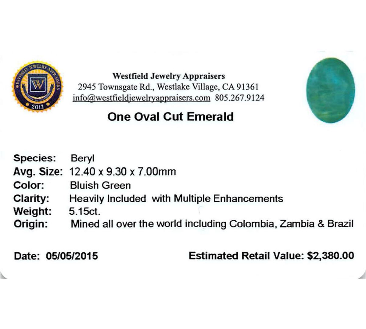 One oval mixed cut natural emerald, measuring 12.40 x 9.30 x 7.00mm, exact weight 5.15ct., clarity is heavily included, type III, dark, very slightly grayish, bluish green color, (GIA bG 7/3), cut is good. Indications of multiple laboratory enhancements, including high temperature heat treatment. Westfield Appraised at $2,380.00.