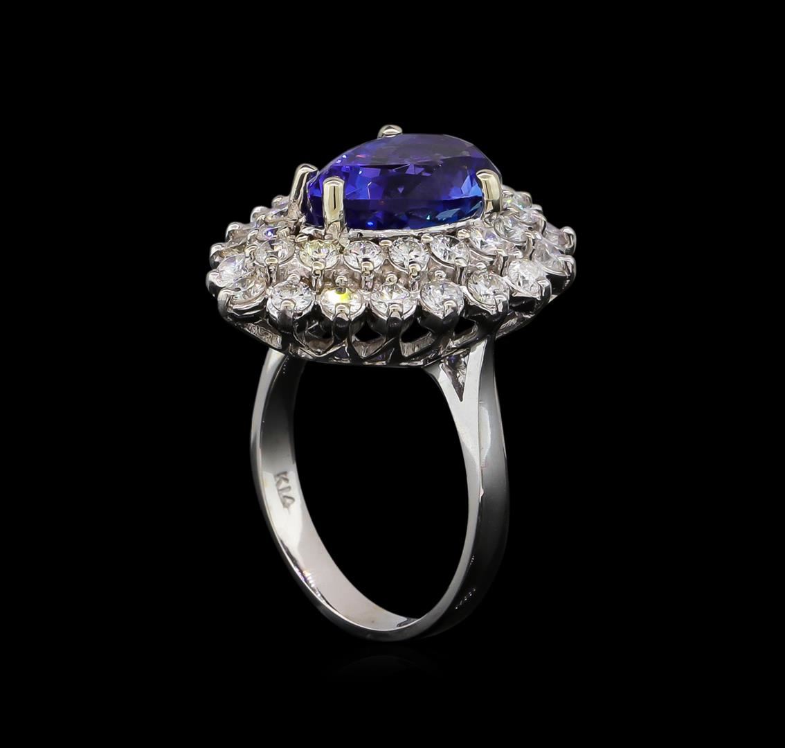 One electronically tested 14KT white gold lady's cast fashion ring with a double basket halo with a bright polish finish. The featured lady's ring has a shank measuring 2.90 millimeters wide. Identified with markings of "K14". Condition is new, good workmanship. Containing: One prong set pear modified brilliant cut natural tanzanite, measuring 12.68 x 8.43 x 6.98mm, 3%. bulge factor, approximate weight of 5.15ct., clarity is eye clean, type I, medium, moderately strong, violetish blue color, (GIA vB 5/4), cut is very good. Transmitting light with no distortion, transparent. Colored gemstones are presumed to have been subjected to commonly used enhancement processes. Graded in the setting. Eighteen prong set round brilliant cut diamonds, measuring 2.60 - 2.50 x 1.58mm (depth est.) approximate. Total Weight of 18 Stones = 1.12ct. Graded in the setting. Clarity: SI-1 to SI-2. Color: H - I. Cut Good Seventeen prong set round brilliant cut diamonds, measuring 2.30 - 2.25 x 1.41mm (depth est.) approximate. Total Weight of 17 Stones = 0.76ct. Graded in the setting. Clarity: VS-2 to SI-2. Color: H - I. Cut Good. Total Weight of Colored Stones 5.15ct. Total Weight of Diamonds 1.88ct. Total Weight of Ring 9.00gm. GAS Appraised at $13,885.00.