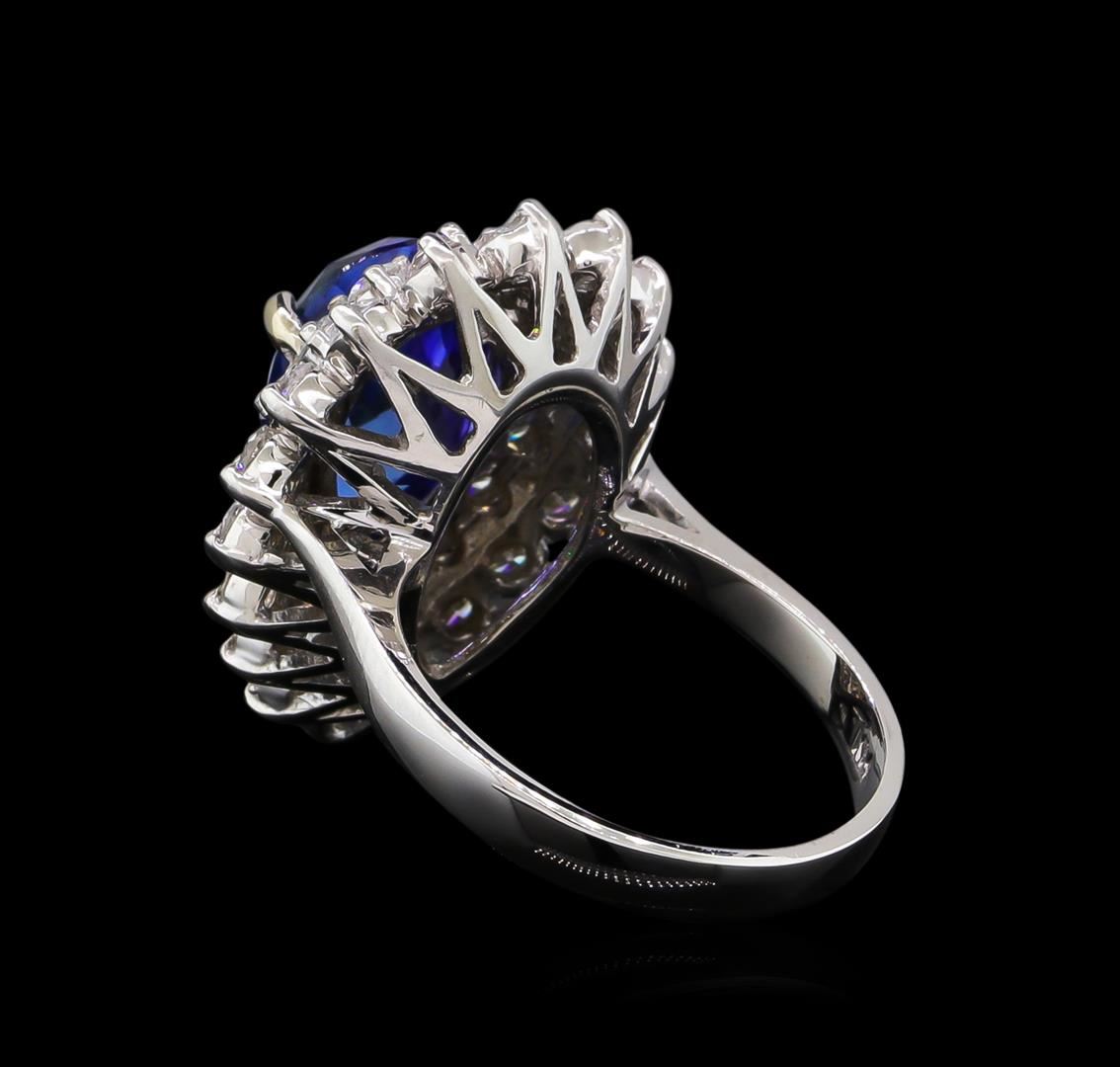 One electronically tested 14KT white gold lady's cast fashion ring with a double basket halo with a bright polish finish. The featured lady's ring has a shank measuring 2.90 millimeters wide. Identified with markings of "K14". Condition is new, good workmanship. Containing: One prong set pear modified brilliant cut natural tanzanite, measuring 12.68 x 8.43 x 6.98mm, 3%. bulge factor, approximate weight of 5.15ct., clarity is eye clean, type I, medium, moderately strong, violetish blue color, (GIA vB 5/4), cut is very good. Transmitting light with no distortion, transparent. Colored gemstones are presumed to have been subjected to commonly used enhancement processes. Graded in the setting. Eighteen prong set round brilliant cut diamonds, measuring 2.60 - 2.50 x 1.58mm (depth est.) approximate. Total Weight of 18 Stones = 1.12ct. Graded in the setting. Clarity: SI-1 to SI-2. Color: H - I. Cut Good Seventeen prong set round brilliant cut diamonds, measuring 2.30 - 2.25 x 1.41mm (depth est.) approximate. Total Weight of 17 Stones = 0.76ct. Graded in the setting. Clarity: VS-2 to SI-2. Color: H - I. Cut Good. Total Weight of Colored Stones 5.15ct. Total Weight of Diamonds 1.88ct. Total Weight of Ring 9.00gm. GAS Appraised at $13,885.00.