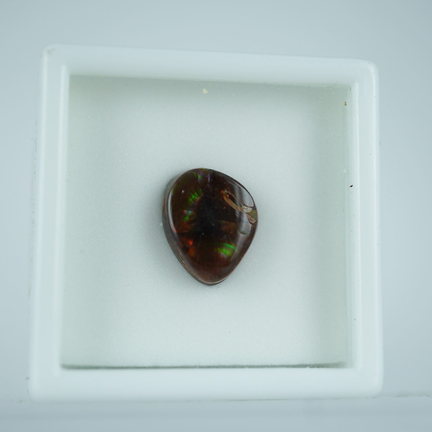 This captivating fire agate gemstone weighs approximately 5.16 carats and showcases an organic freeform shape with iridescent flashes of green, gold, and red beneath its rich brown surface. Fire agate is a rare and naturally occurring variety of chalcedony, celebrated for its fiery internal glow and mesmerizing play of color. This one-of-a-kind gemstone is ideal for collectors or custom artistic settings, and it comes housed in a protective display case for safekeeping.