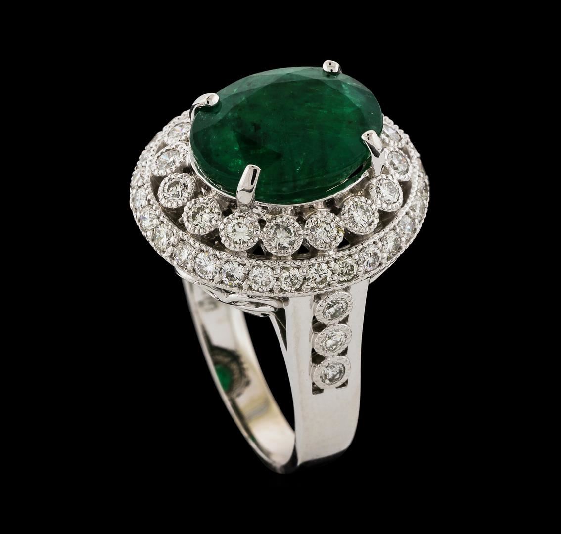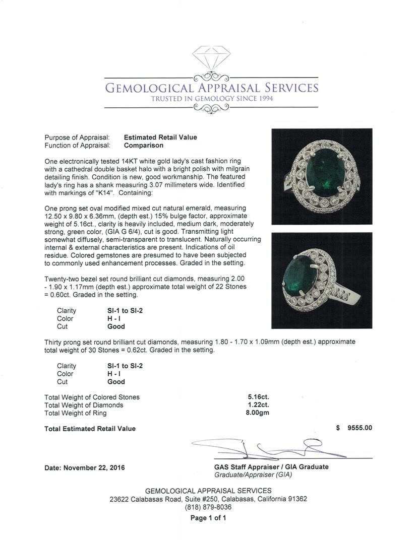 One electronically tested 14KT white gold lady's cast fashion ring with a cathedral double basket halo with a bright polish with milgrain detailing finish. The featured lady's ring has a shank measuring 3.07 millimeters wide. Identified with markings of 'K14'. Condition is new, good workmanship. Containing: One prong set oval modified mixed cut natural emerald, measuring 12.50 x 9.80 x 6.36mm, (depth est.) 15%. bulge factor, approximate weight of 5.16ct., clarity is heavily included, medium dark, moderately strong, green color, (GIA G 6/4), cut is good. Transmitting light somewhat diffusely, semi-transparent to translucent. Naturally occurring internal & external characteristics are present. Indications of oil residue. Colored gemstones are presumed to have been subjected to commonly used enhancement processes. Graded in the setting. Twenty-Two bezel set round brilliant cut diamonds, measuring 2.00 - 1.90 x 1.17mm (depth est.) approximate total weight of 22 Stones = 0.60ct. Graded in the setting. Clarity SI-1 to SI-2. Color: H - I Cut Good Thirty prong set round brilliant cut diamonds, measuring 1.80 - 1.70 x 1.09mm (depth est.) approximate total weight of 30 Stones = 0.62ct. Graded in the setting. Clarity SI-1 to SI-2. Color: H - I Cut Good. Total Weight of Colored Stones 5.16ct.. Total Weight of Diamonds 1.22ct.. Total Weight of Ring 8.00gm. GAS Appraised at $9,555.00.