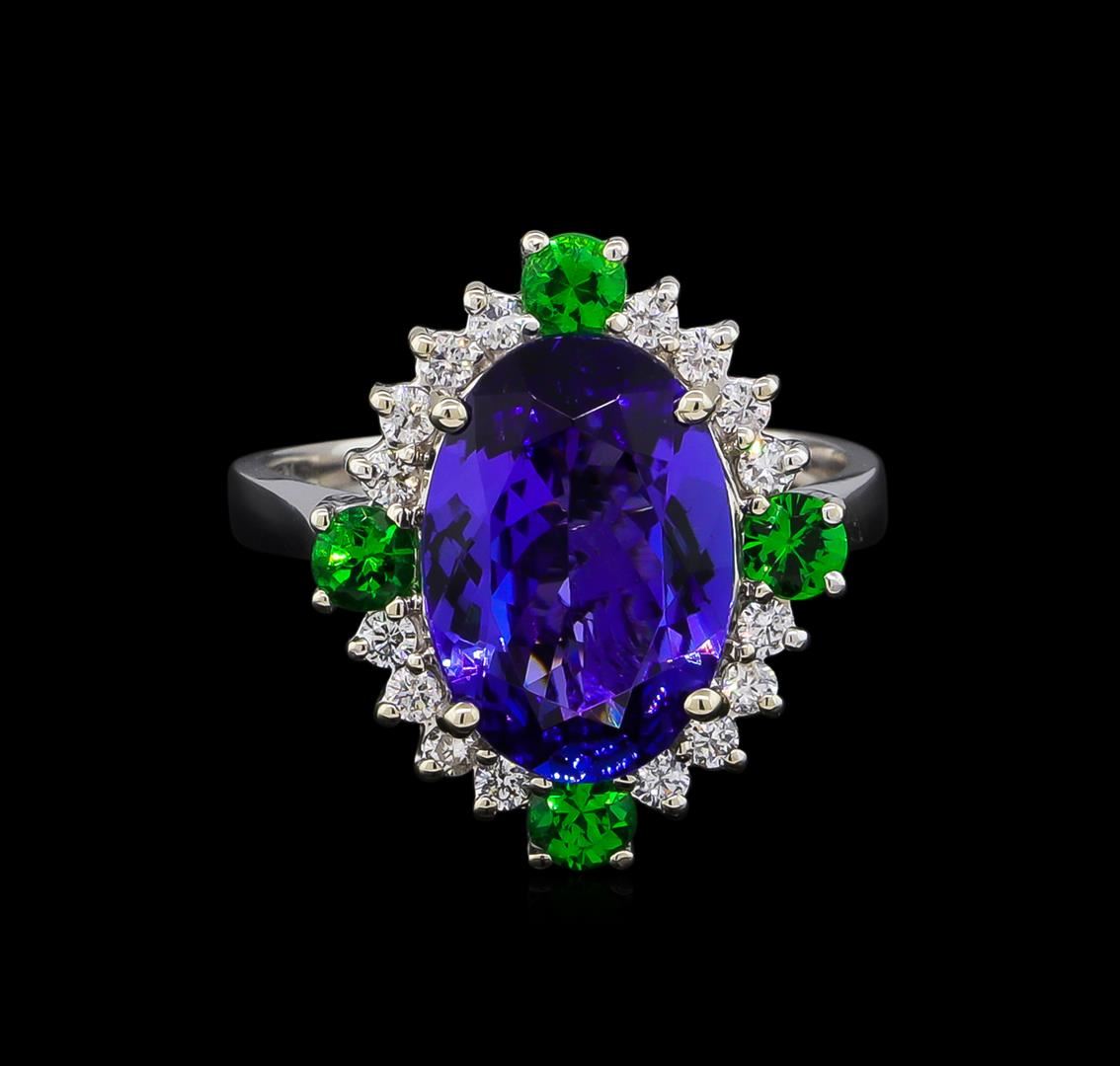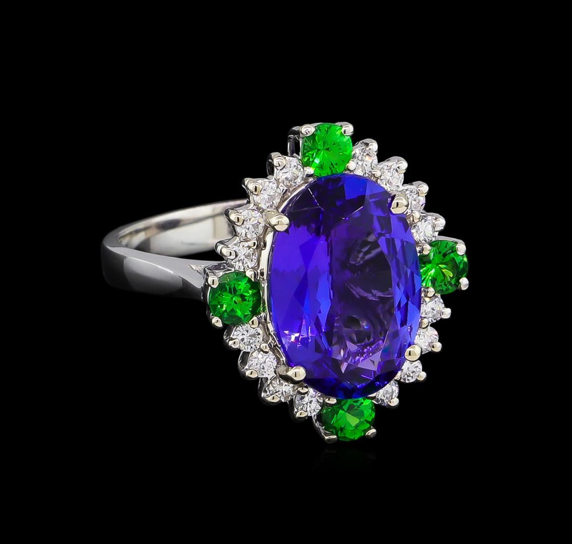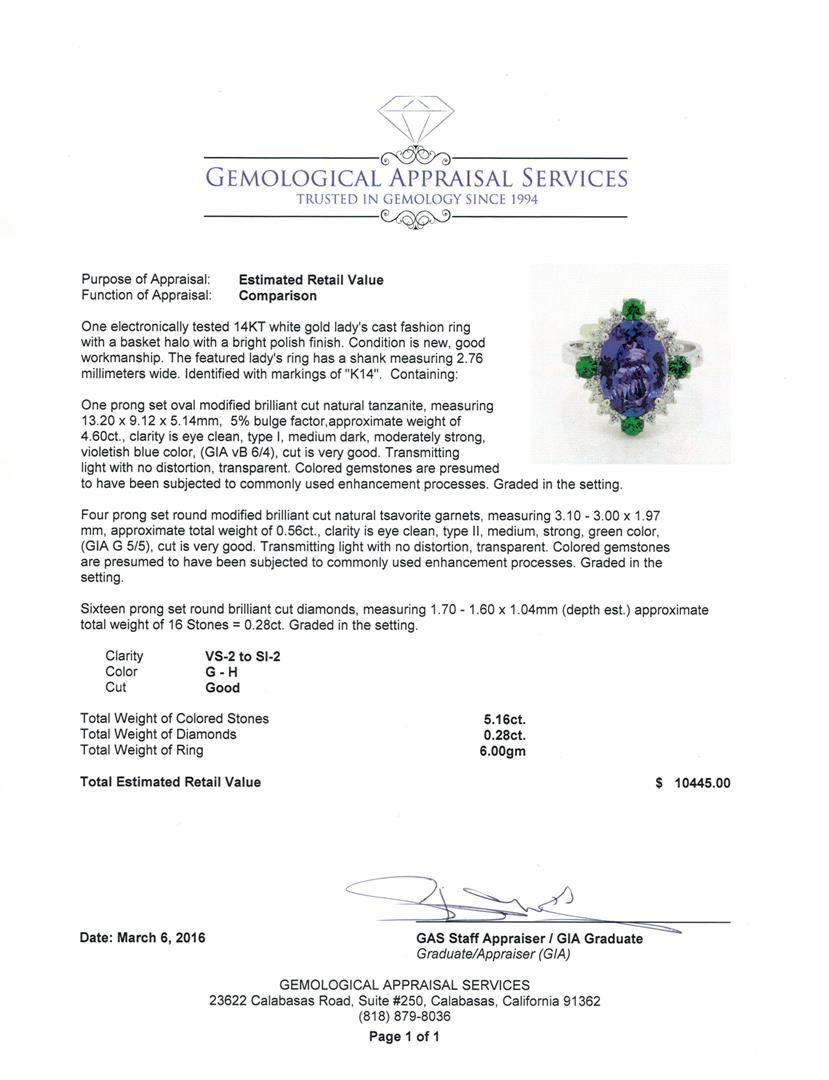 One electronically tested 14KT white gold lady's cast fashion ring with a basket halo with a bright polish finish. The featured lady's ring has a shank measuring 2.76 millimeters wide. Identified with markings of "K14". Condition is new, good workmanship. Containing: One prong set oval modified brilliant cut natural tanzanite, measuring 13.20 x 9.12 x 5.14mm, 5%. bulge factor, approximate weight of 4.60ct., clarity is eye clean, type I, medium dark, moderately strong, violetish blue color, (GIA vB 6/4), cut is very good. Transmitting light with no distortion, transparent. Colored gemstones are presumed to have been subjected to commonly used enhancement processes. Graded in the setting. Four prong set round modified brilliant cut natural tsavorite garnets, measuring 3.10 - 3.00 x 1.97 mm, approximate. Total Weight of 0.56ct., clarity is eye clean, type II, medium, strong, green color, (GIA G 5/5), cut is very good. Transmitting light with no distortion, transparent. Colored gemstones are presumed to have been subjected to commonly used enhancement processes. Graded in the setting. Sixteen prong set round brilliant cut diamonds, measuring 1.70 - 1.60 x 1.04mm (depth est.) approximate. Total Weight of 16 Stones = 0.28ct. Graded in the setting. Clarity: VS-2 to SI-2. Color: G - H. Cut Good. Total Weight of Colored Stones 5.16ct. Total Weight of Diamonds 0.28ct. Total Weight of Ring 6.00gm. GAS Appraised at $10,445.00.