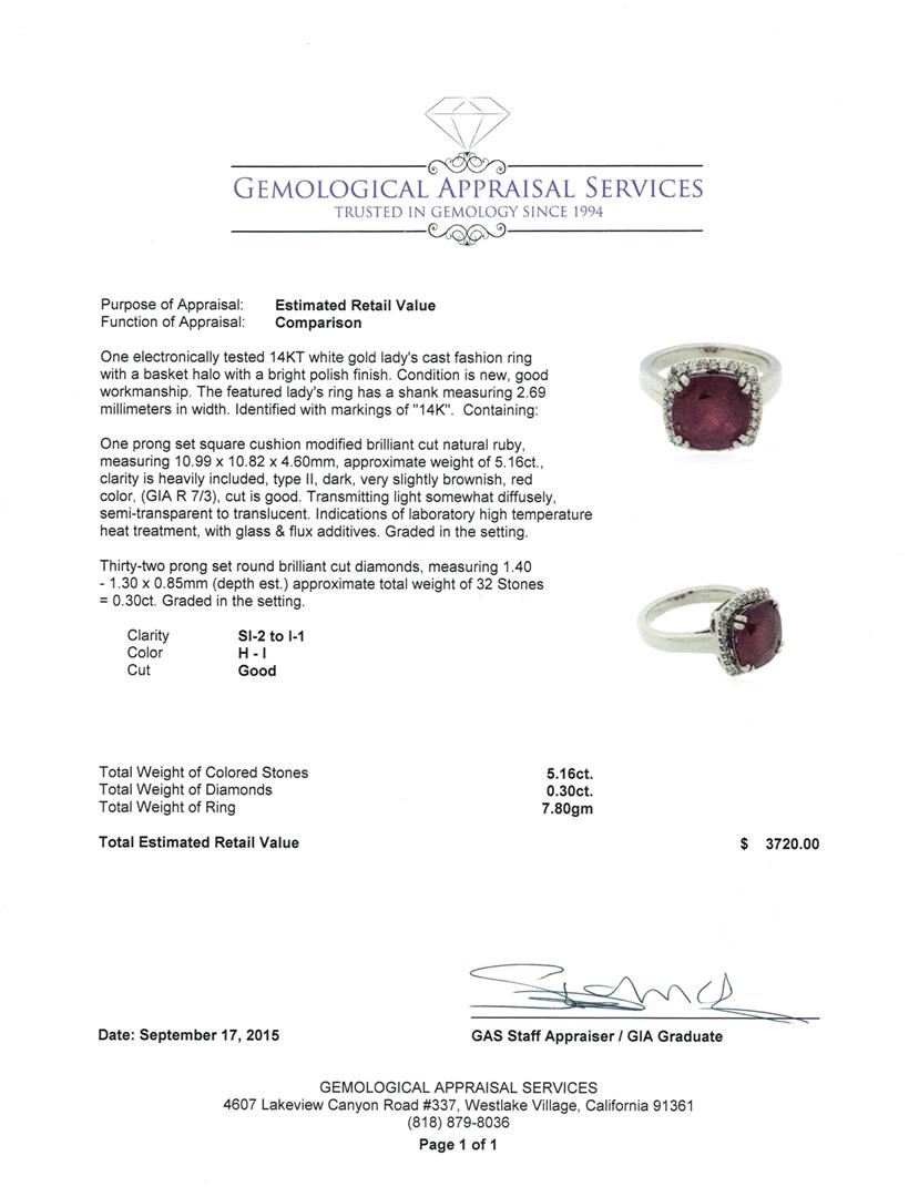 One electronically tested 14KT white gold lady's cast fashion ring with a basket halo with a bright polish finish. The featured lady's ring has a shank measuring 2.69 millimeters in width. Identified with markings of "14K". Condition is new, good workmanship. Containing: One prong set square cushion modified brilliant cut natural ruby, measuring 10.99 x 10.82 x 4.60mm, approximate weight of 5.16ct., clarity is heavily included, type II, dark, very slightly brownish, red color, (GIA R 7/3), cut is good. Transmitting light somewhat diffusely, semi-transparent to translucent. Indications of laboratory high temperature heat treatment, with glass & flux additives. Graded in the setting. Thirty-Two prong set round brilliant cut diamonds, measuring 1.40 - 1.30 x 0.85mm (depth est.) approximate total weight of 32 Stones = 0.30ct. Graded in the setting. Clarity: SI-2 to I-1. Color: H - I. Cut Good. Total Weight of Colored Stones 5.16ct. Total Weight of Diamonds 0.30ct. Total Weight of Ring 7.80gm. GAS Appraised at $3,720.00.