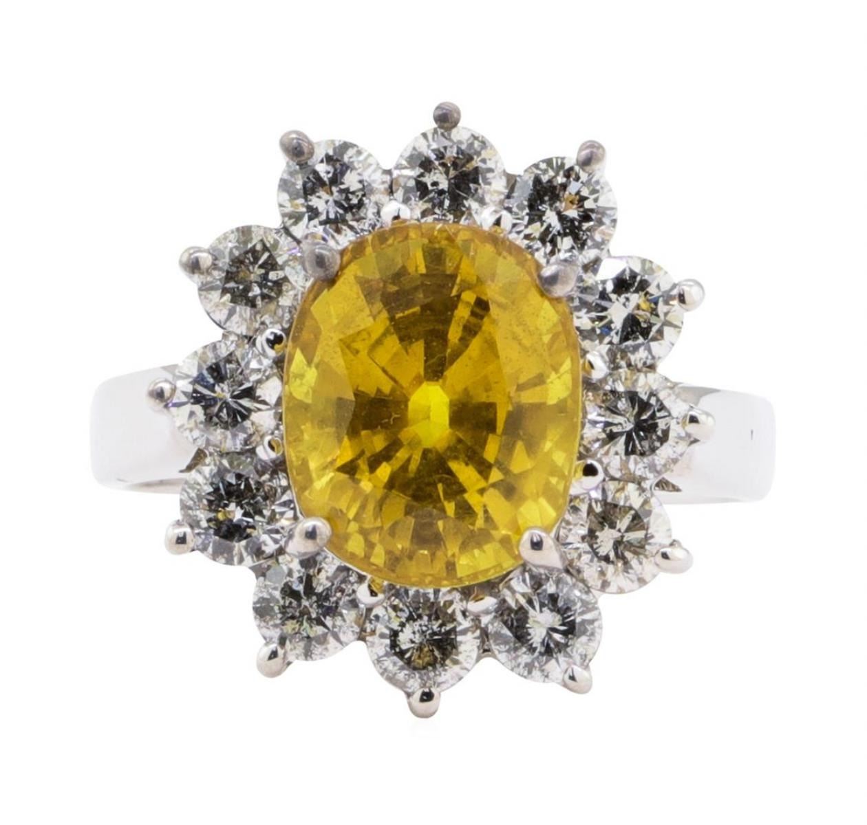 One electronically tested 14KT white gold ladies cast yellow sapphire & diamond ring. The featured yellow sapphire is set within a diamond bezel supported by an elaborate lattice under gallery, completed by a three millimeter wide band. Bright polish finish. Identified with markings of "14K". Condition is new, very good workmanship. Containing: One prong set oval cut natural yellow sapphire, measuring 10.00 x 8.30 x 6.95mm, 5% bulge factor, approximate weight of 5.16ct., clarity is eye clean, type II, medium, brownish, yellow color, (GIA Y 5/3), cut is good. Transmitting light with no distortion, transparent. Naturally occurring internal & external characteristics are present. Graded in the setting. Twelve prong set round brilliant cut diamonds, measuring 3.30 - 3.20 x 1.95mm (depth est.) exact total weight 12 Stones = 1.49ct. Graded in the setting. Clarity I-1 Color G - H Total Weight of Colored Stones 5.16 ct. Total Weight of Diamonds 1.49 ct. Total Weight of Ring 6.00 gm Estimated Retail Value $ 14,200.00 US