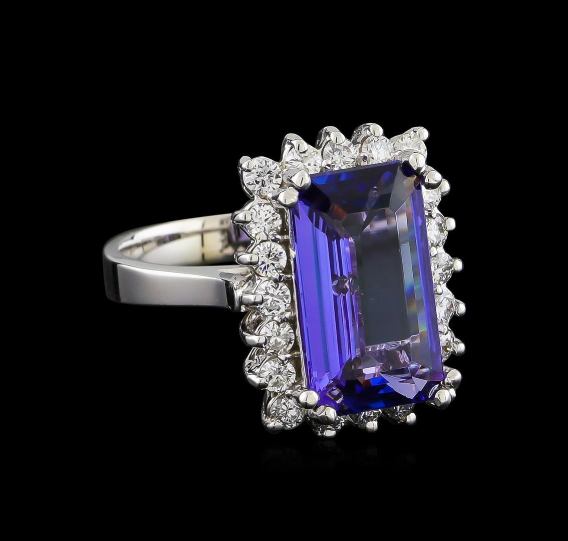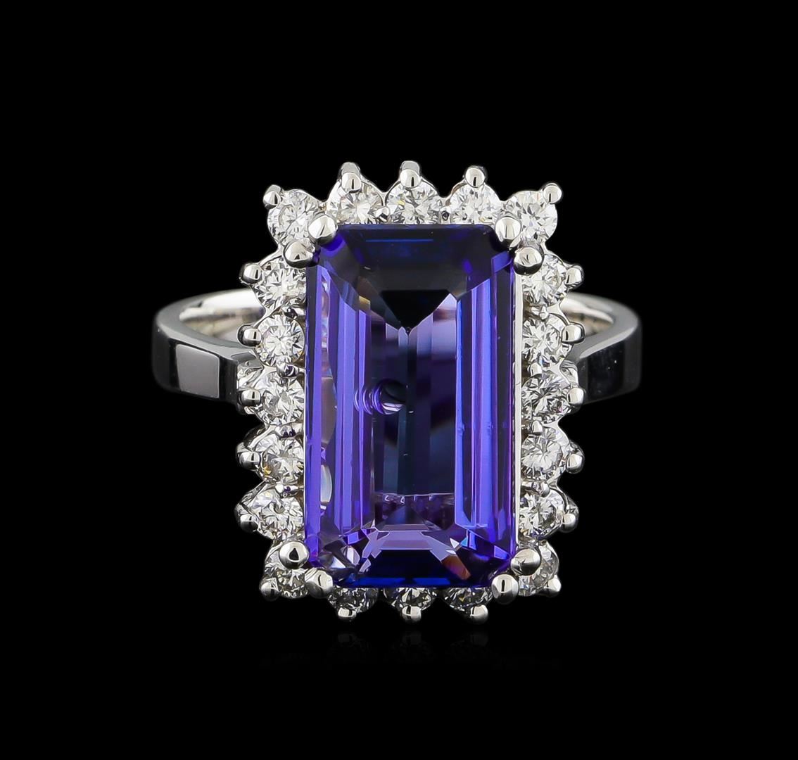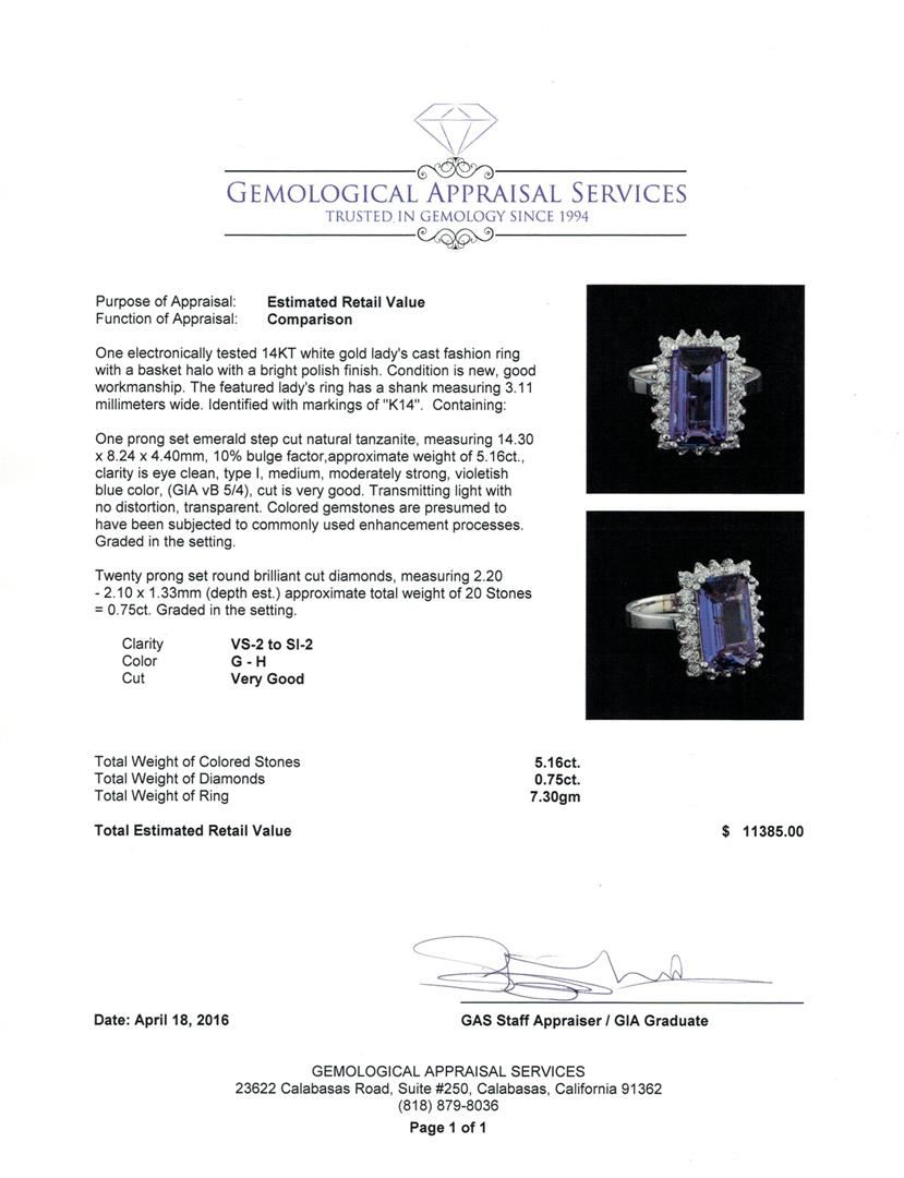 One electronically tested 14KT white gold lady's cast fashion ring with a basket halo with a bright polish finish. The featured lady's ring has a shank measuring 3.11 millimeters wide. Identified with markings of "K14". Condition is new, good workmanship. Containing: One prong set emerald step cut natural tanzanite, measuring 14.30 x 8.24 x 4.40mm, 10%. bulge factor, approximate weight of 5.16ct., clarity is eye clean, type I, medium, moderately strong, violetish blue color, (GIA vB 5/4), cut is very good. Transmitting light with no distortion, transparent. Colored gemstones are presumed to have been subjected to commonly used enhancement processes. Graded in the setting. Twenty prong set round brilliant cut diamonds, measuring 2.20 - 2.10 x 1.33mm (depth est.) approximate total weight of 20 Stones = 0.75ct. Graded in the setting. Clarity: VS-2 to SI-2. Color: G - Very Good. Total Weight of Colored Stones 5.16ct. Total Weight of Diamonds 0.75ct. Total Weight of Ring 7.30gm. GAS Appraised at $11,385.00.