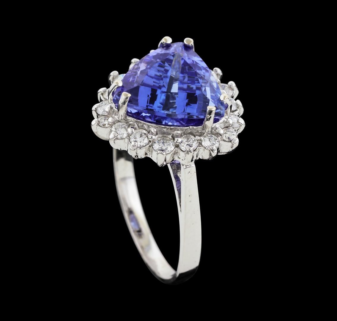 One electronically tested 14KT white gold lady's cast fashion ring with a cathedral shank with a basket halo with a bright polish finish. The featured lady's ring has a shank measuring 2.00 millimeters wide. Identified with markings of 'K14'. Condition is new, good workmanship. Containing: One prong set triangle modified brilliant cut natural tanzanite, measuring 11.22 x 11.02 x 7.77mm, (depth est.) approximate weight of 5.16ct., clarity is eye clean, medium, very slightly grayish, violetish blue color, (GIA vB 5/3), cut is very good. Transmitting light with no distortion, transparent. Colored gemstones are presumed to have been subjected to commonly used enhancement processes. Graded in the setting. Three prong set round brilliant cut diamonds, measuring 2.30 - 2.20 x 1.40mm (depth est.) approximate total weight of 3 Stones = 0.13ct. Graded in the setting. Clarity SI-1 to SI-2. Color: H - I Cut Good Twelve prong set round brilliant cut diamonds, measuring 2.00 - 1.85 x 1.20mm (depth est.) approximate total weight of 12 Stones = 0.33ct. Graded in the setting. Clarity SI-1 to SI-3. Color: H - I Cut Good Three prong set round brilliant cut diamonds, measuring 1.70 - 1.60 x 1.01mm (depth est.) approximate total weight of 3 Stones = 0.05ct. Graded in the setting. Clarity SI-1 to SI-3. Color: H - I Cut Good. Total Weight of Colored Stones 5.16ct.. Total Weight of Diamonds 0.51ct.. Total Weight of Ring 4.80gm. GAS Appraised at $9,530.00.
