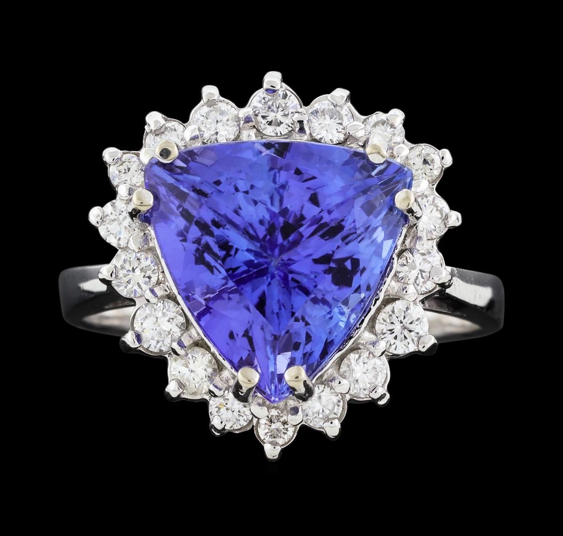 One electronically tested 14KT white gold lady's cast fashion ring with a cathedral shank with a basket halo with a bright polish finish. The featured lady's ring has a shank measuring 2.00 millimeters wide. Identified with markings of 'K14'. Condition is new, good workmanship. Containing: One prong set triangle modified brilliant cut natural tanzanite, measuring 11.22 x 11.02 x 7.77mm, (depth est.) approximate weight of 5.16ct., clarity is eye clean, medium, very slightly grayish, violetish blue color, (GIA vB 5/3), cut is very good. Transmitting light with no distortion, transparent. Colored gemstones are presumed to have been subjected to commonly used enhancement processes. Graded in the setting. Three prong set round brilliant cut diamonds, measuring 2.30 - 2.20 x 1.40mm (depth est.) approximate total weight of 3 Stones = 0.13ct. Graded in the setting. Clarity SI-1 to SI-2. Color: H - I Cut Good Twelve prong set round brilliant cut diamonds, measuring 2.00 - 1.85 x 1.20mm (depth est.) approximate total weight of 12 Stones = 0.33ct. Graded in the setting. Clarity SI-1 to SI-3. Color: H - I Cut Good Three prong set round brilliant cut diamonds, measuring 1.70 - 1.60 x 1.01mm (depth est.) approximate total weight of 3 Stones = 0.05ct. Graded in the setting. Clarity SI-1 to SI-3. Color: H - I Cut Good. Total Weight of Colored Stones 5.16ct.. Total Weight of Diamonds 0.51ct.. Total Weight of Ring 4.80gm. GAS Appraised at $9,530.00.