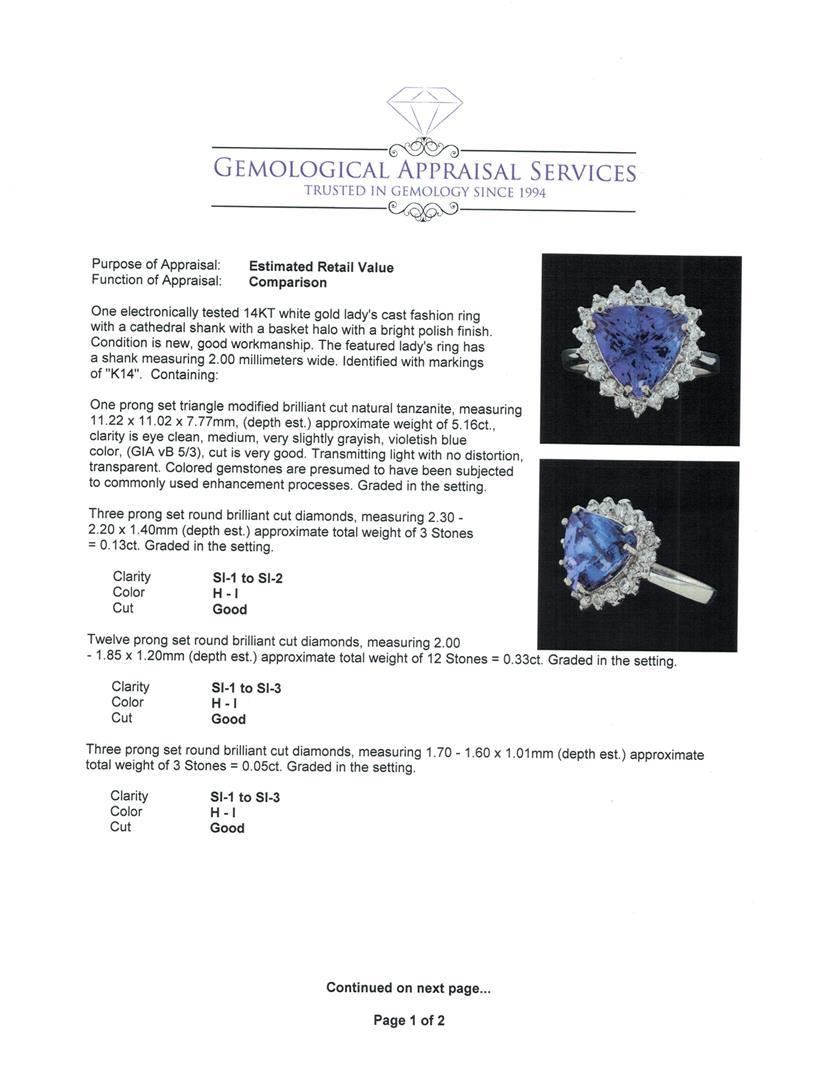 One electronically tested 14KT white gold lady's cast fashion ring with a cathedral shank with a basket halo with a bright polish finish. The featured lady's ring has a shank measuring 2.00 millimeters wide. Identified with markings of 'K14'. Condition is new, good workmanship. Containing: One prong set triangle modified brilliant cut natural tanzanite, measuring 11.22 x 11.02 x 7.77mm, (depth est.) approximate weight of 5.16ct., clarity is eye clean, medium, very slightly grayish, violetish blue color, (GIA vB 5/3), cut is very good. Transmitting light with no distortion, transparent. Colored gemstones are presumed to have been subjected to commonly used enhancement processes. Graded in the setting. Three prong set round brilliant cut diamonds, measuring 2.30 - 2.20 x 1.40mm (depth est.) approximate total weight of 3 Stones = 0.13ct. Graded in the setting. Clarity SI-1 to SI-2. Color: H - I Cut Good Twelve prong set round brilliant cut diamonds, measuring 2.00 - 1.85 x 1.20mm (depth est.) approximate total weight of 12 Stones = 0.33ct. Graded in the setting. Clarity SI-1 to SI-3. Color: H - I Cut Good Three prong set round brilliant cut diamonds, measuring 1.70 - 1.60 x 1.01mm (depth est.) approximate total weight of 3 Stones = 0.05ct. Graded in the setting. Clarity SI-1 to SI-3. Color: H - I Cut Good. Total Weight of Colored Stones 5.16ct.. Total Weight of Diamonds 0.51ct.. Total Weight of Ring 4.80gm.