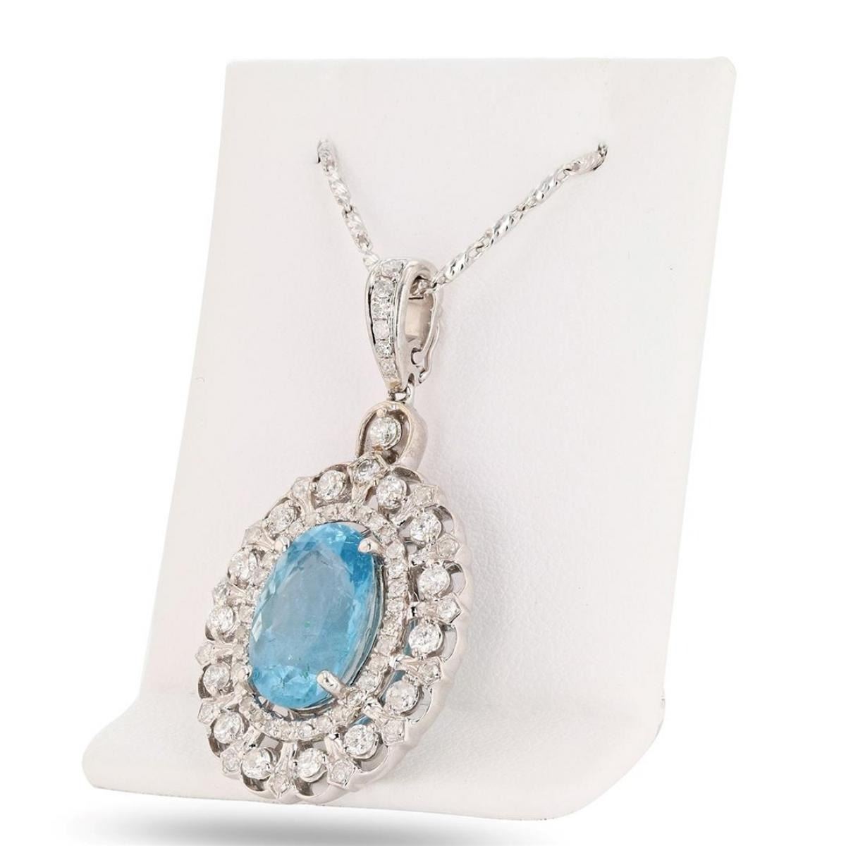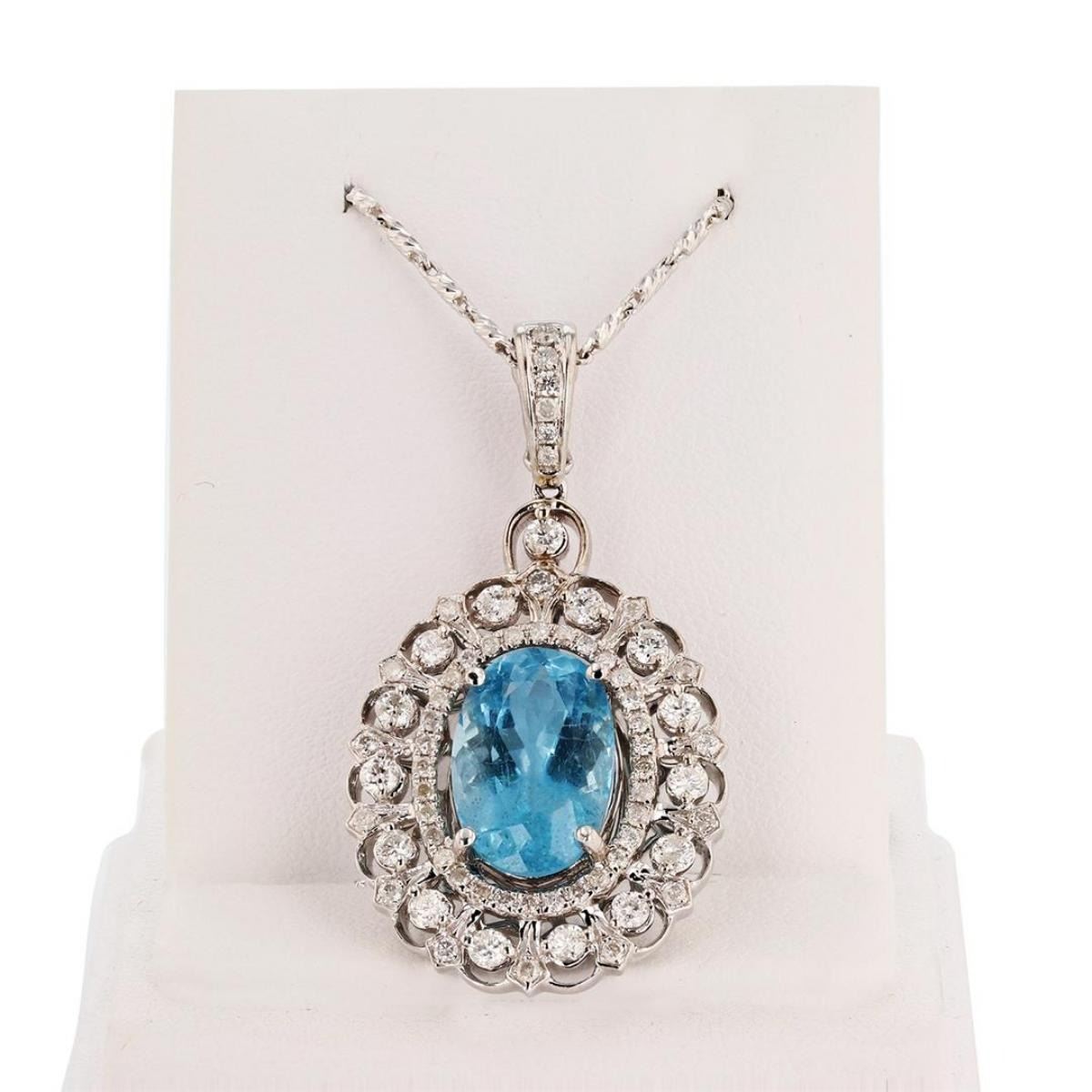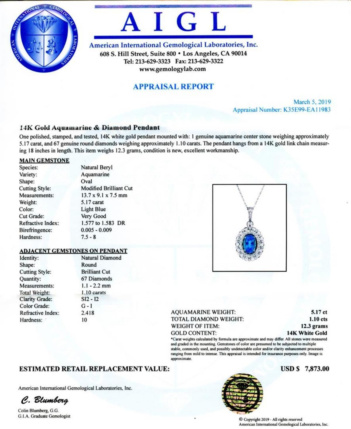 14K Gold Aquamarine and Diamond Pendant One polished, stamped, and tested, 14K white gold pendant mounted with: 1 genuine aquamarine center stone weighing approximately 5.17 carat, and 67 genuine round diamonds weighing approximately 1.10 carats. The pendant hangs from a 14K gold link chain measur-ing 18 inches in length. This item weighs 12.3 grams, condition is new, excellent workmanship. MAIN GEMSTONE Species: Natural Beryl Variety: Aquamarine Shape: Oval Cutting Style: Modified Brilliant Cut Measurements: 13.7 x 9.1 x 7.5 mm Weight: 5.17 carat Color: Light Blue Cut Grade: Very Good Refractive Index: 1.577 to 1.583 DR Birefringence: 0.005 - 0.009 Hardness: 7.5 - 8 ADJACENT GEMSTONES ON PENDANT Identity: Natural Diamond Shape: Round Cutting Style: Brilliant Cut Quantity: 67 Diamonds Measurements: 1.1 - 2.2 mm Total Weight: 1.10 carats Clarity Grade: SI-2 to I-2 Color Grade: G-I Refractive Index: 2.418 Hardness: 10 AQUAMARINE WEIGHT: 5.17 ct TOTAL DIAMOND WEIGHT: 1.10 cts WEIGHT OF ITEM: 12.3 grams GOLD CONTENT: 14K White Gold