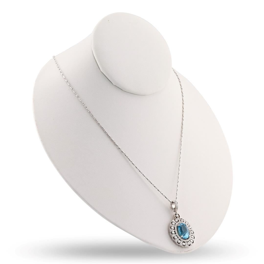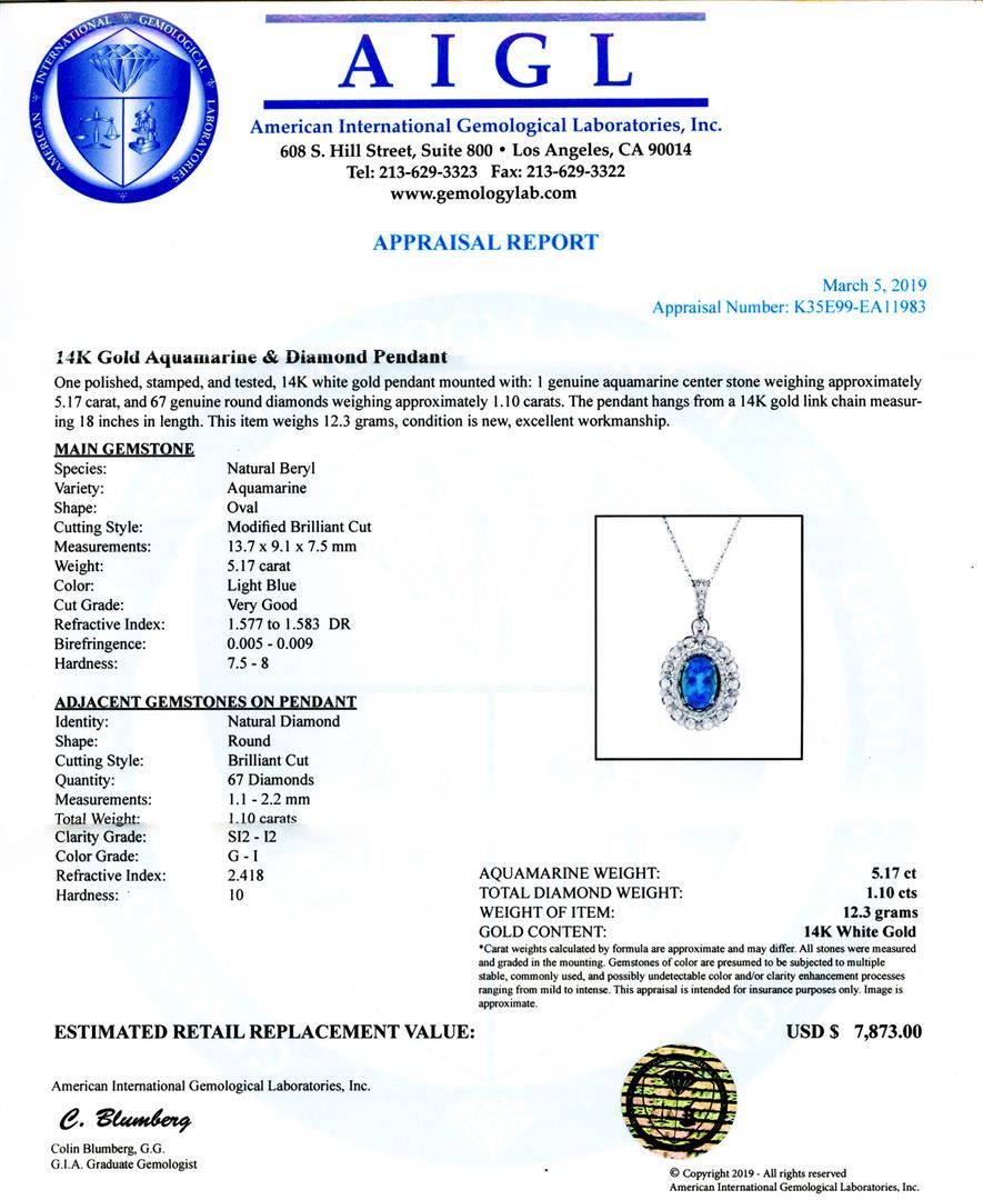 14K Gold Aquamarine and Diamond Pendant One polished, stamped, and tested, 14K white gold pendant mounted with: 1 genuine aquamarine center stone weighing approximately 5.17 carat, and 67 genuine round diamonds weighing approximately 1.10 carats. The pendant hangs from a 14K gold link chain measur-ing 18 inches in length. This item weighs 12.3 grams, condition is new, excellent workmanship. MAIN GEMSTONE Species: Natural Beryl Variety: Aquamarine Shape: Oval Cutting Style: Modified Brilliant Cut Measurements: 13.7 x 9.1 x 7.5 mm Weight: 5.17 carat Color: Light Blue Cut Grade: Very Good Refractive Index: 1.577 to 1.583 DR Birefringence: 0.005 - 0.009 Hardness: 7.5 - 8 ADJACENT GEMSTONES ON PENDANT Identity: Natural Diamond Shape: Round Cutting Style: Brilliant Cut Quantity: 67 Diamonds Measurements: 1.1 - 2.2 mm Total Weight: 1.10 carats Clarity Grade: SI-2 to I-2 Color Grade: G-I Refractive Index: 2.418 Hardness: 10 AQUAMARINE WEIGHT: 5.17 ct TOTAL DIAMOND WEIGHT: 1.10 cts WEIGHT OF ITEM: 12.3 grams GOLD CONTENT: 14K White Gold