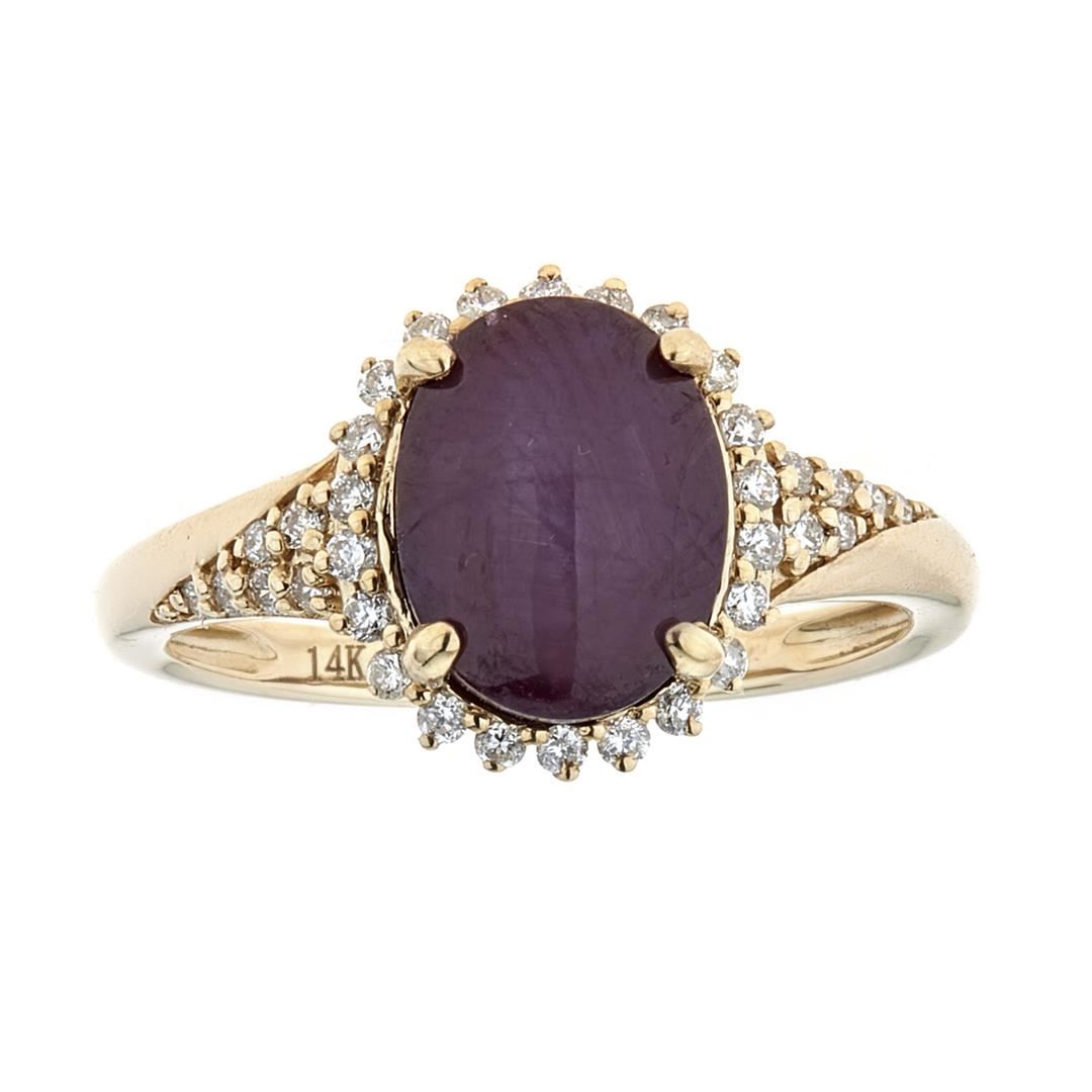 One Lady's Star Ruby and Diamond Ring. Setting: 14 KT Yellow Gold Mounting. Additional: 34 Round Diamonds = 0.25 Cts. TWT (G-H/SI-I1). Center Gem Stone Information: Species: Natural Corundum. Variety: Star Ruby. Phenomenon: Asterism (6 Ray Star). Shape and Cut: Cabochon. Measurements: 9.73 x 7.53 x 5.80 mm. Weight: 5.17 Carats. Transparency: Semi-Translucent. Color Hue: Purplish Red. Saturation: Moderately Strong. Total Weight: 2.42 grams.