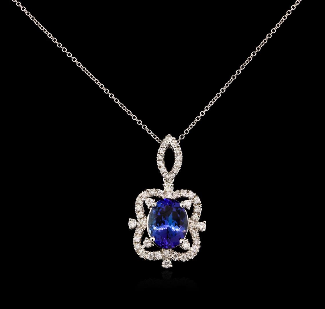 One electronically tested 14KT white gold lady's combination cast & assembled fashion pendant & chain 18.0" long, 1.2mm round cable link with a spring ring clasp with a bright polish finish. Identified with markings of "14K". Condition is new, good workmanship. Containing: One prong set oval modified brilliant cut natural tanzanite, measuring 12.02 x 9.36 x 6.44mm, approximate weight of 5.17ct., clarity is eye clean, type I, medium dark, moderately strong, violetish blue color, (GIA vB 6/4), cut is very good. Transmitting light with no distortion, transparent. Colored gemstones are presumed to have been subjected to commonly used enhancement processes. Graded in the setting. Eight prong set round brilliant cut diamonds, measuring 2.00 - 1.90 x 1.17mm (depth est.) approximate total weight of 8 Stones = 0.22ct. Graded in the setting. Clarity: SI-1 to SI-2. Color: H - I. Cut Good Forty-One prong set round brilliant cut diamonds, measuring 1.50 - 1.40 x 0.90mm (depth est.) approximate total weight of 41 Stones = 0.48ct. Graded in the setting. Clarity: SI-1 to SI-2. Color: G - I. Cut Good. Total Weight of Colored Stones 5.17ct. Total Weight of Diamonds 0.70ct. Total Weight of Pendant & Chain 7.50gm. GAS Appraised at $11,800.00.