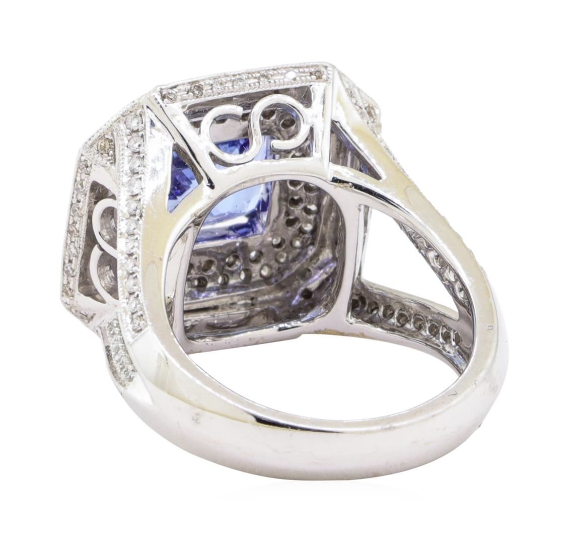 One electronically tested 14KT white gold ladies cast tanzanite and diamond ring. The featured tanzanite is set with two tiered diamond bezels supported by diamond set split shoulders, completed by a two and one-half millimeter wide band. Bright polish finish with milgrain detailing. Trademark is Orianne. Identified with markings of "14K". Condition is new, good workmanship. Containing: One prong set rectangular cushion mixed cut natural tanzanite, measuring 9.40 x 8.90 x 7.80mm, approximate weight of 5.17ct., clarity is eye clean, type I, dark, very slightly grayish, violetish blue color, (GIA vB 7/3), cut is good. Transmitting light with no distortion, transparent. Colored Stone Grading Report attached. Graded in the setting. Tanzanite is a very rare gemstone that is only found in the country of Tanzania. Originally discovered in 1967. Tiffany & Company, named the stone Tanzanite. It is found in the Usumburu Mountains that border the Umba Valley of northern Tanzania. Tanzanite occurs in gray, brown, violet, blue, reddish-purple, & green. The gem is interesting because of its exceptional pleochroism. Rotated in different directions a tanzanite will exhibit multiple changes of color. Tanzanite has a low tolerance to ultrasonic cleaning, and should not be cleaned using this method. Two Hundred Twenty prong set round brilliant cut diamonds, measuring 1.20 - 1.10 x 0.69mm (depth est.) approximate total weight of 220 Stones = 1.33ct. Graded in the setting. Clarity SI-1 to I-1 Color G - I Total Weight of Colored Stones 5.17 ct. Total Weight of Diamonds 1.33 ct. Estimated Retail Value $ 18,590.00 US