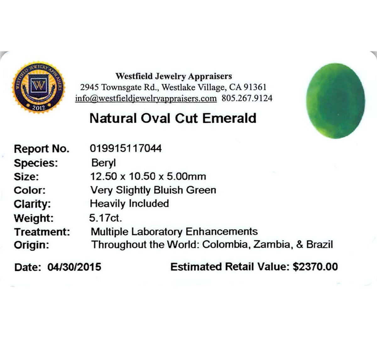 One oval mixed cut natural emerald exact weight 5.17ct., clarity is heavily included, type III, medium dark, very slightly grayish, very slightly bluish green color, (GIA vslbG 6/3), cut is good. Westfield Appraised at $2,370.00.