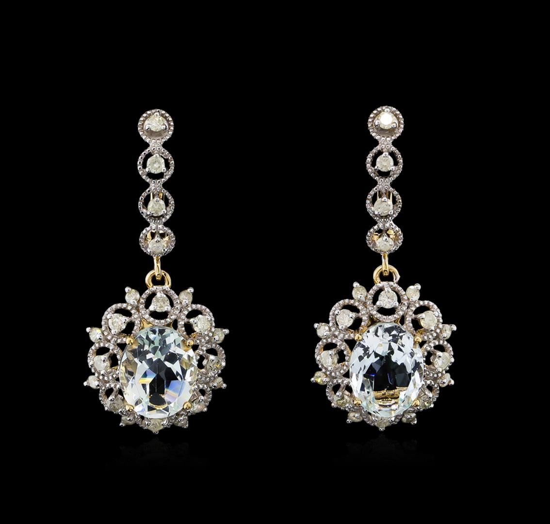 One pair electronically tested 14KT yellow gold lady's combination cast & assembled dangle earrings with hinged, snap locking posts with a bright polish with milgrain detailing finish. Trademark is Orianne. Identified with markings of "14K". Condition is new, good workmanship. Containing: Two prong set oval modified brilliant cut natural aquamarines, measuring 10.45 x 8.03 x 5.15mm, approximate total weight of 5.18ct., clarity is eye clean, type I, very light, moderately strong, blue color, (GIA B 2/4), cut is good. Transmitting light with no distortion, transparent. Colored gemstones are presumed to have been subjected to commonly used enhancement processes. Graded in the setting. Twenty-Four prong set round brilliant cut diamonds, measuring 2.10 - 2.00 x 1.27mm (depth est.) approximate total weight of 24 Stones = 0.78ct. Graded in the setting. Clarity: I-1 to I-2. Color: I - Good Sixteen prong set round brilliant cut diamonds, measuring 1.60 - 1.50 x 0.98mm (depth est.) approximate total weight of 16 Stones = 0.24ct. Graded in the setting. Clarity: I-1 to I-2. Color: I - Good. Total Weight of Colored Stones 5.18ct. Total Weight of Diamonds 1.02ct. Total Weight of Earrings 7.20gm. GAS Appraised at $8,000.00.