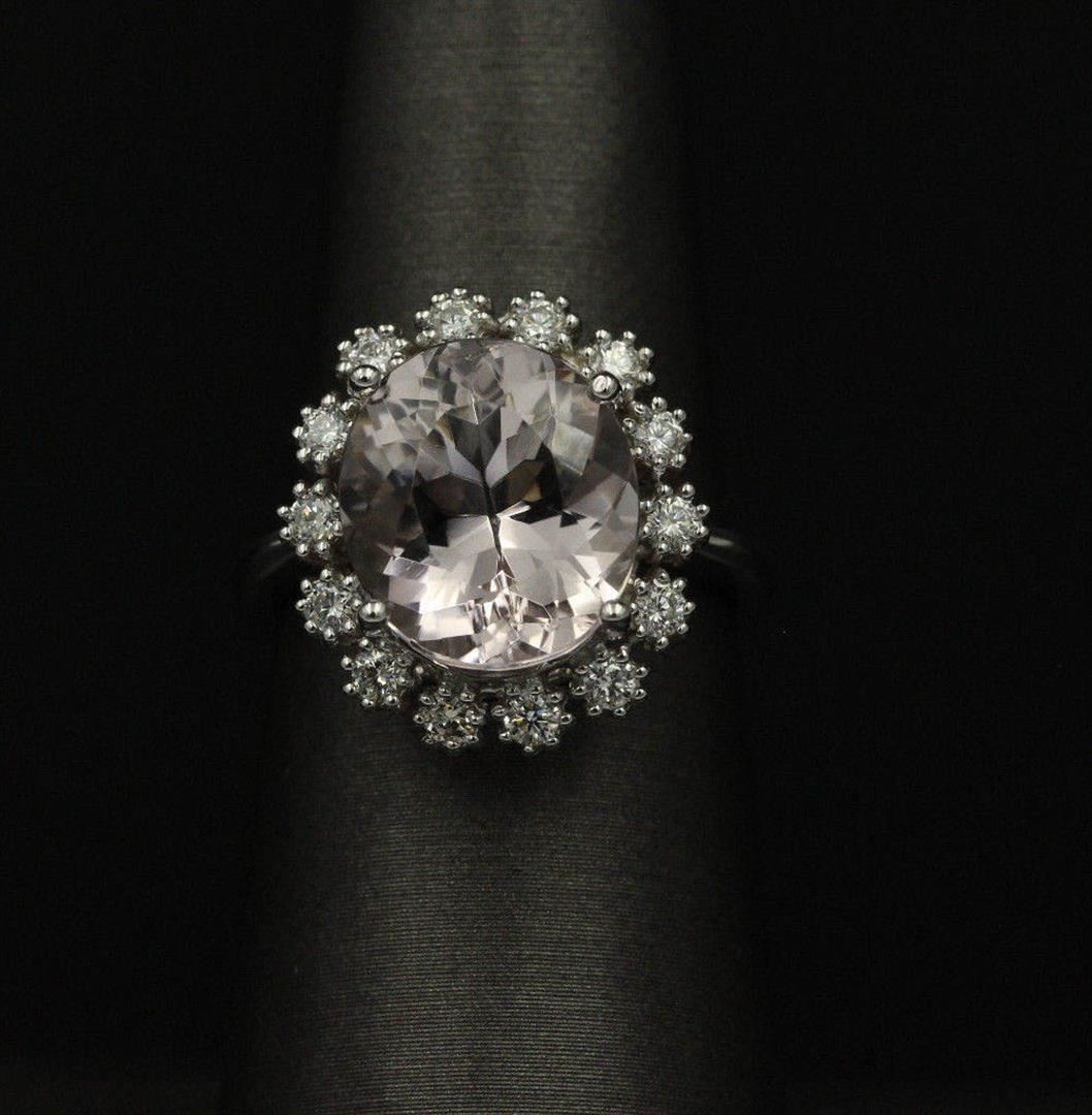 One morganite and diamond ring featuring: 14KT white gold weighing 5.72 grams containing one morganite weighing 5.18ct and 14 diamonds weighing 0.14ctw. The morganite is round brilliant cut with fine medium clarity, pink color and very good cut. The diamo