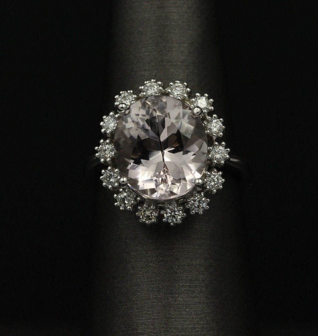 One morganite and diamond ring featuring: 14KT white gold weighing 5.72 grams containing one morganite weighing 5.18ct and 14 diamonds weighing 0.14ctw. The morganite is round brilliant cut with fine medium clarity, pink color and very good cut. The diamo