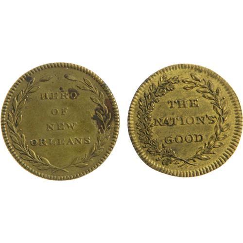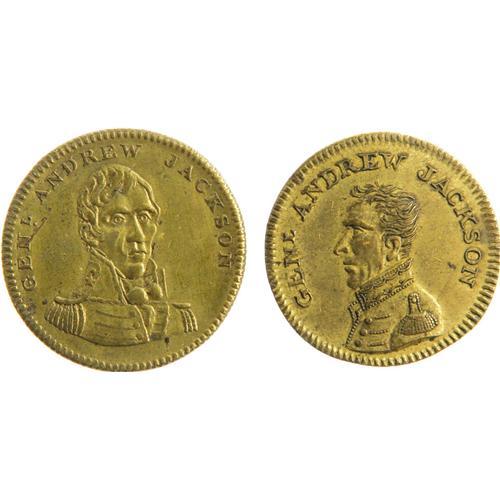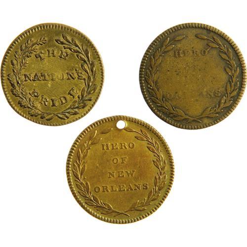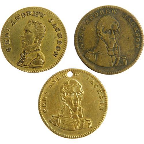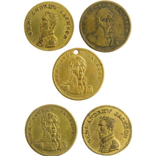<B>Five 1824 Andrew Jackson Election Tokens in Brass.</B></I> This lot features five tokens from the "Tenth Election" of 1824. The tokens here are Sullivan-Dewitt AJack 1824-1, 2, 3, 4, and 5. It is a rare opportunity to get all five of these in one lot! <BR><B>AJack 1824-1</B></I> measures 25mm and is in almost uncirculated condition; it has some slight toning on the reverse. This is the only one of the five that is holed. <BR><B>AJack 1824-2</B></I> also measures 25mm and has the same obverse and reverse as the previous except that the wreath has 38 leaves and 18 berries whereas the other has 37 leaves and twenty berries. This example is in excellent condition with a nice dark patina. The words on the reverse "Hero of New Orleans has all but rubbed away. <BR><B>AJack 1824-3</B></I> is also the same as the preceding two except for some minor changes to Jackson's coat. This token is also in excellent condition with some slight soiling and wear on the reverse. <BR><B>AJack 1824-4</B></I> has Jackson facing to the side on the obverse and the reverse reads "The Nation's Good". It is in excellent condition aside from soiling on both sides. <BR><B>AJack 1824-5</B></I> is much like AJack 1824-4 aside from the reverse reading "The Nation's Pride". This token measures 24mm and is in excellent condition except for some soiling on both sides and some slight wearing away of two letters, "IO" on the reverse.