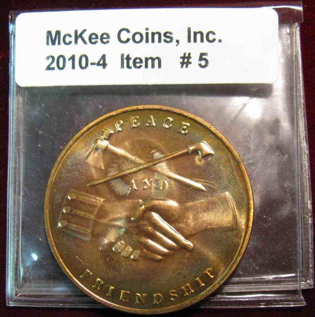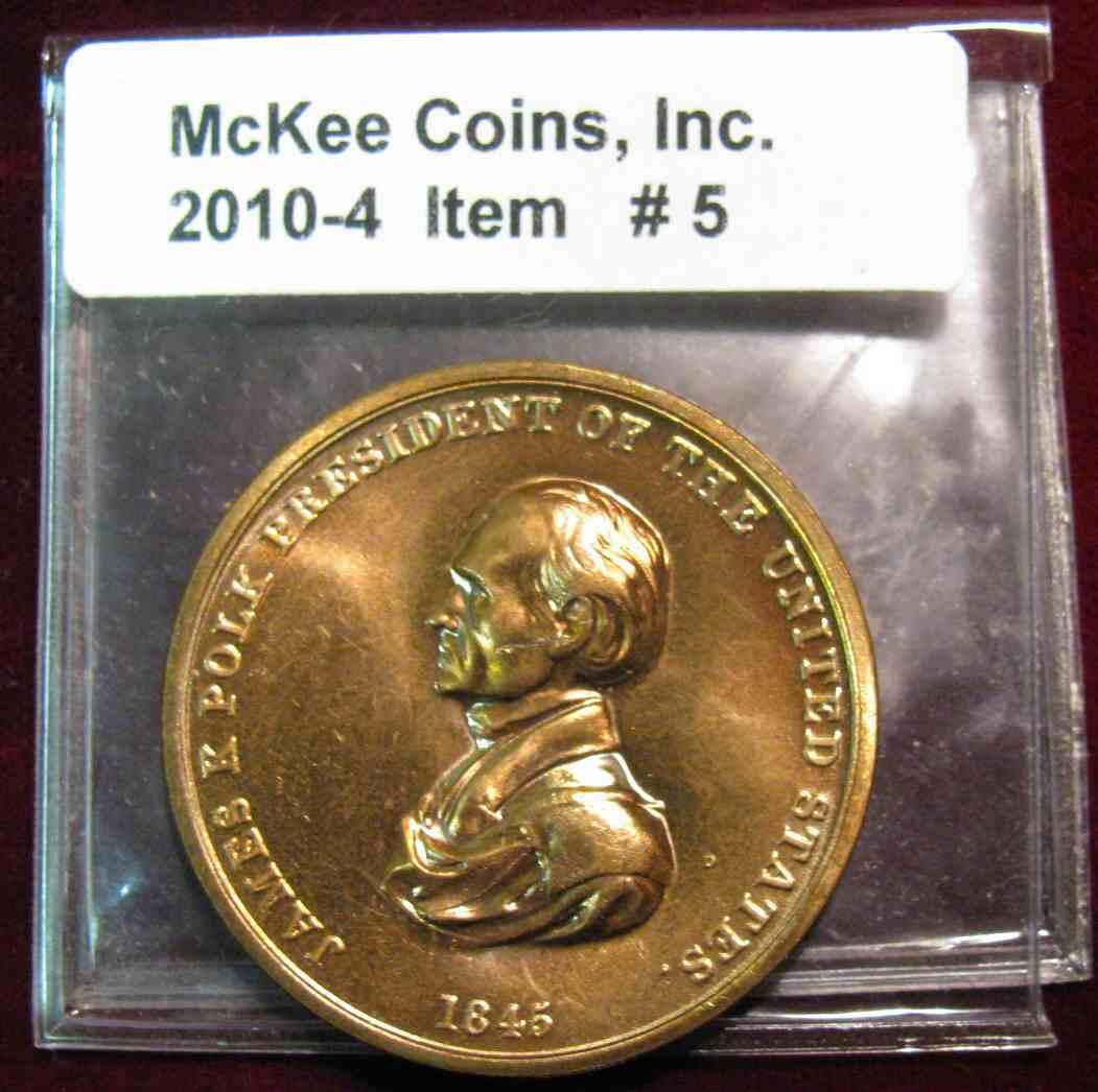 5. 1845 James K. Polk U.S. Mint Peace Medal. BU. Reverse "Peace and Friendship" Crossed peace pipe & tomahawk with clasped hands below. 34mm. Encapsulated. BU.