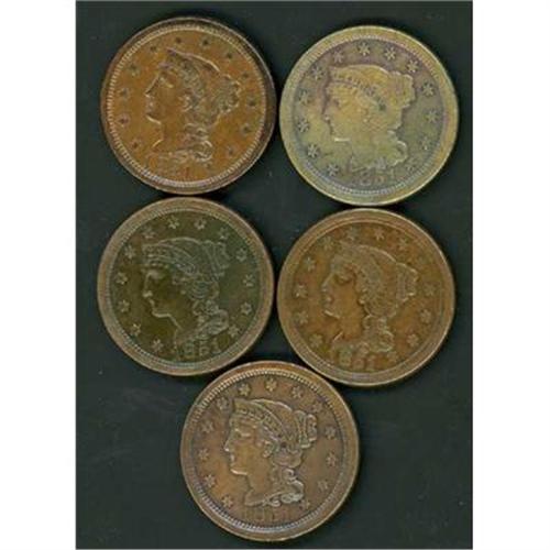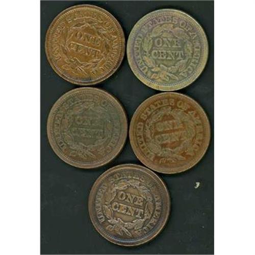 N-4 R1 VF20. MDS, die state b. N-13 R1 VF35. M-LDS, die state c. N-31 R3+ VF25+. MDS, die state b. N-38 R1 VF25. EDS, die state a. N-39 R3 VF30. LDS, die state b. A couple are sharper with defects. Lot of 5 coins.