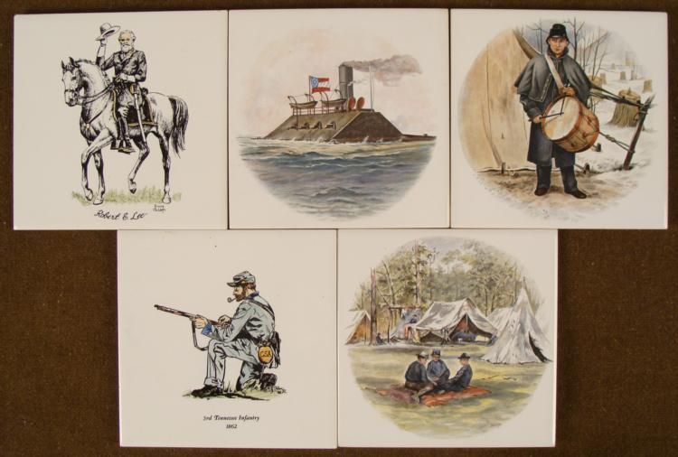 OFFERED HERE ARE FIVE CIVIL WAR CERAMIC TILES. THEY ARE 6" SQUARE, WITH ROBERT E. LEE, DRUMMER, 3RD TENNESSEE INFANTRY - 1862, ETC. THESE ARE NICE DISPLAY PIECES. *