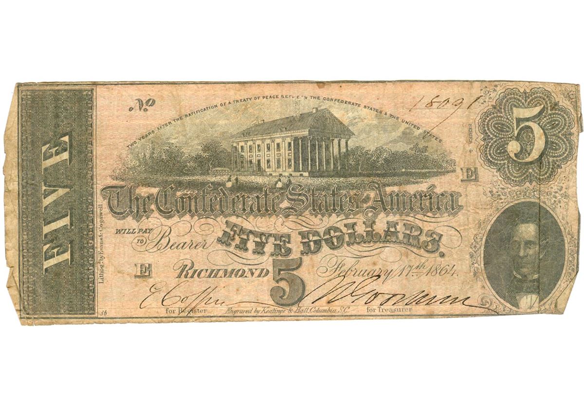 One $5 1864 Richmond Virginia Confederate States of America Bank Note.